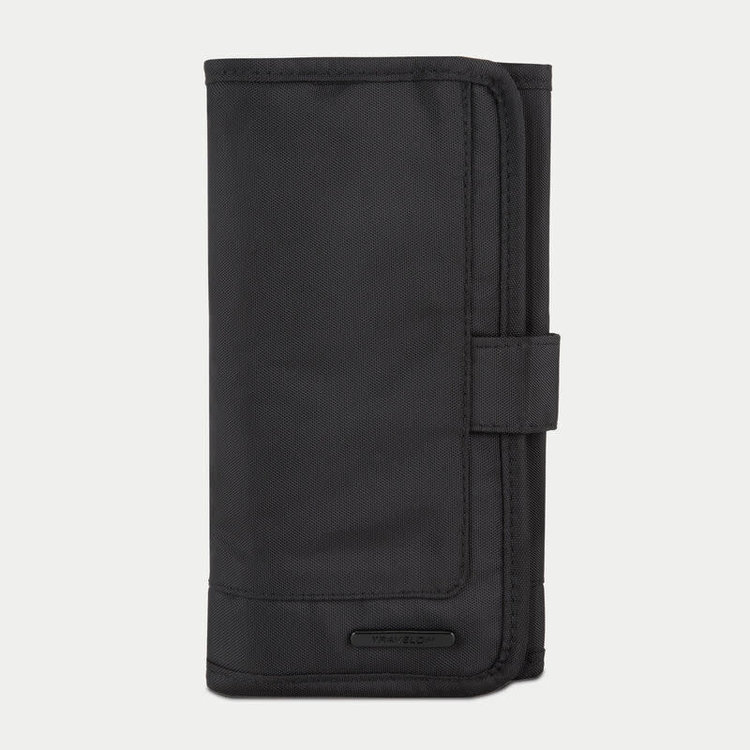 The Travelon Deluxe Tech Accessory Organizer is made from durable polyester. It folds up into a slim shape that makes it efficient use of space in any tote bag, briefcase, backpack, or travel bag.
