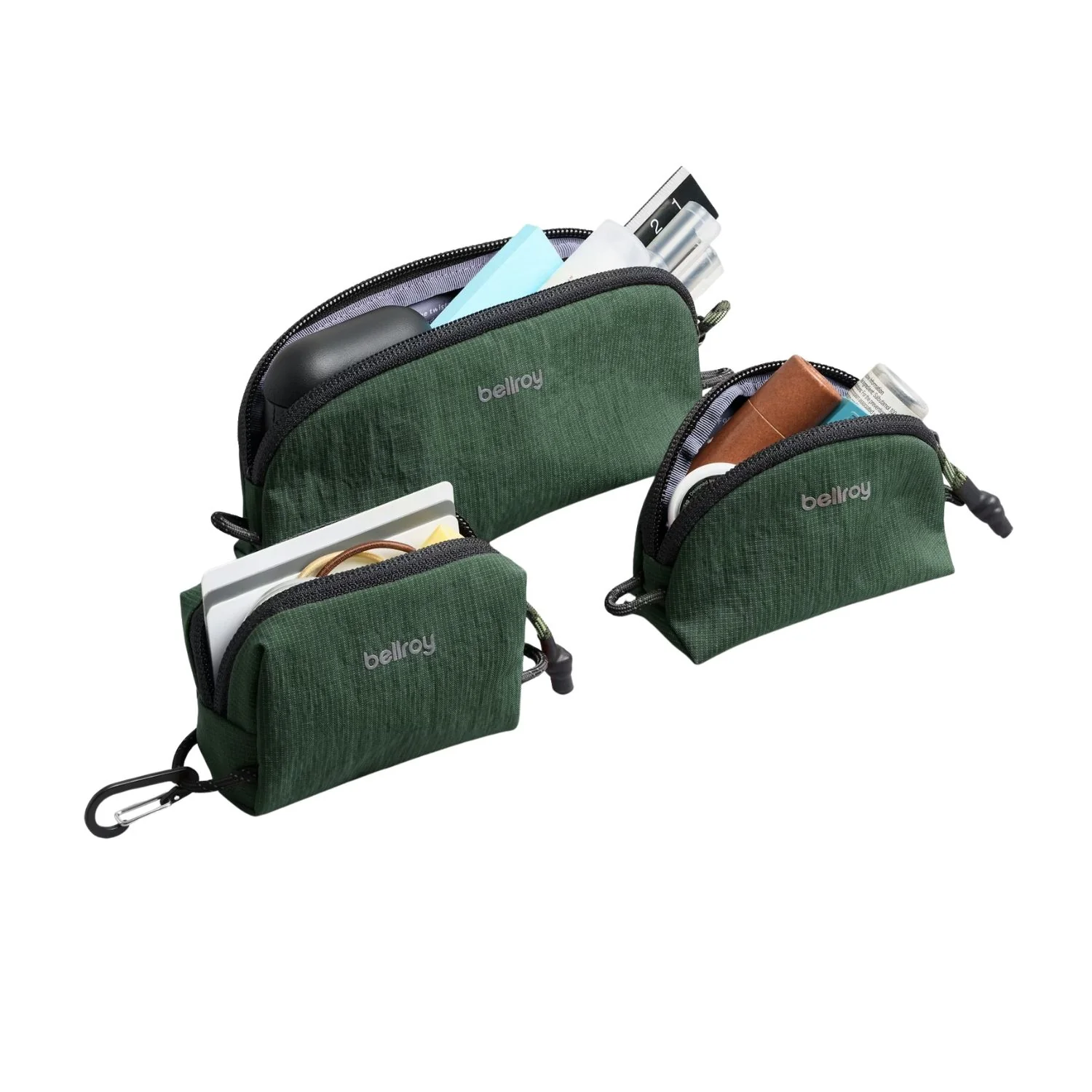 A set of super-lightweight organizer pouches, for packing, sorting and attaching.