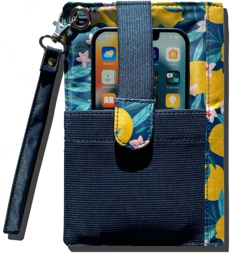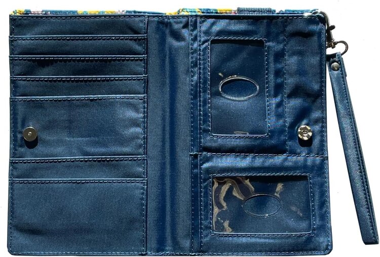 Inside are six credit card pockets, two clear ID card pockets and a billfold area that's big enough to accommodate even outsized foreign currency. An additional two extra-large inside pockets will easily hold your passports and traveling papers. Our myPhone smart phone wallet is 6 1/8 inches by 4 1/8 inches in size. The cell phone pocket is 6 1/8 inches by 3 3/4 inches. Order yours in black, purple, ocean blue or verdant green.
