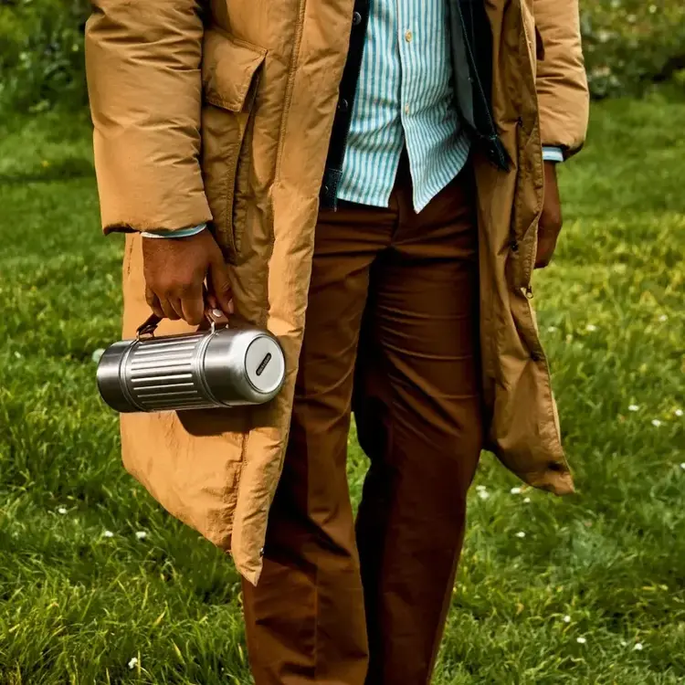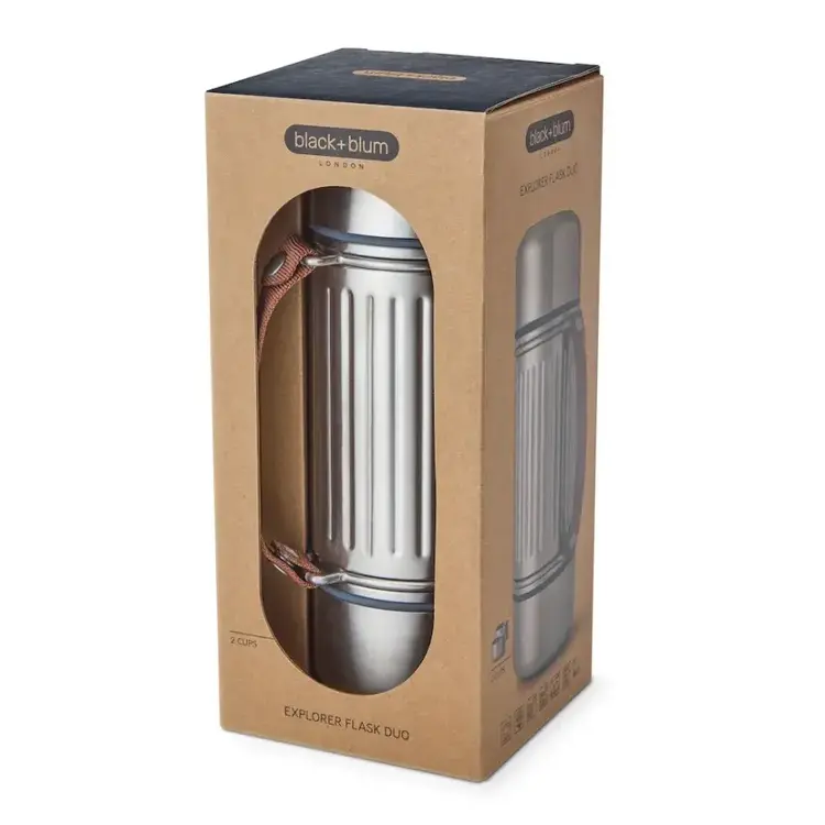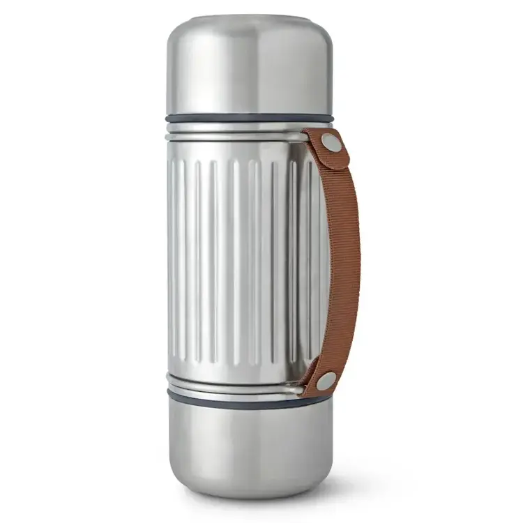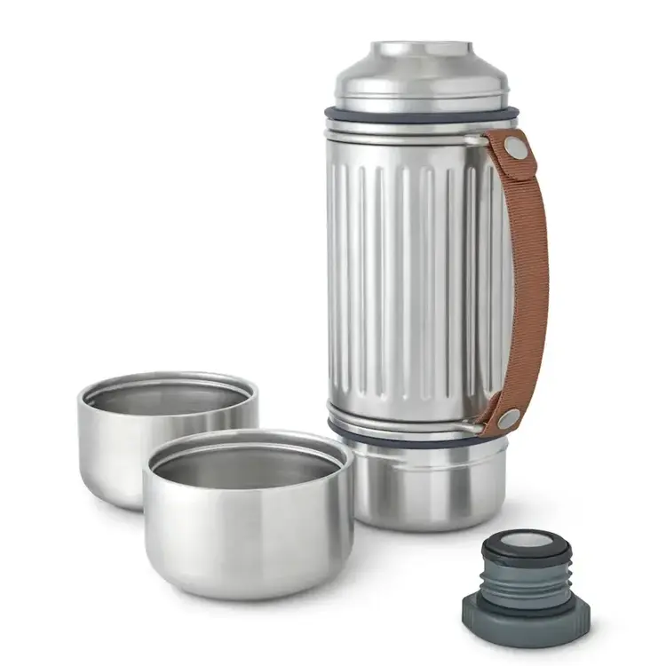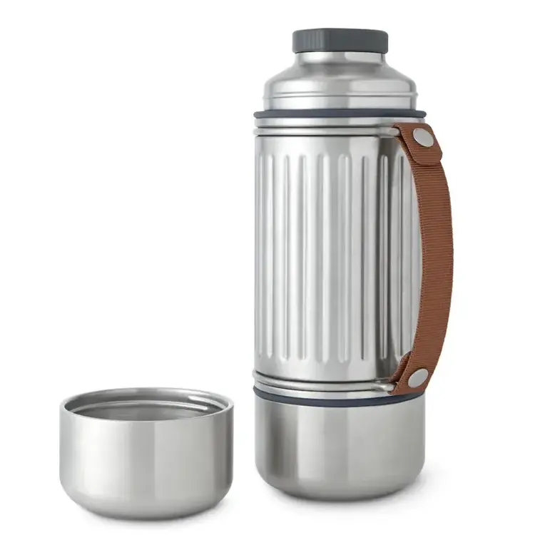 A robust, 1 litre capacity vacuum-insulated flask designed to be shared by two people. It features two double-walled stainless steel cups that screw securely onto the top and base. This flask will keep your drinks hot or cold for up to 24 hours. The thick nylon handle makes it easy to carry and use, and the cap is completely plastic-free. The flask and cups are dishwasher safe for easy cleaning.