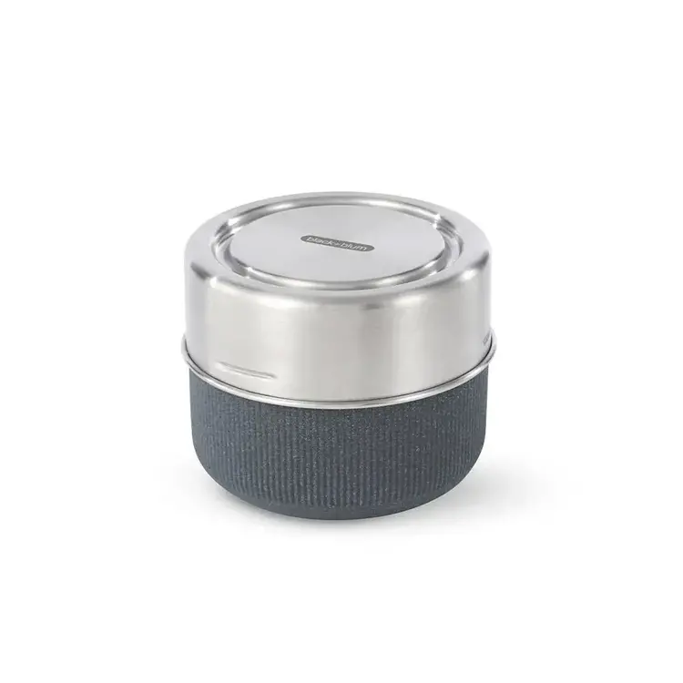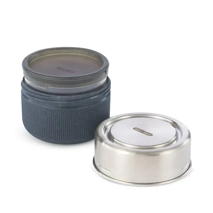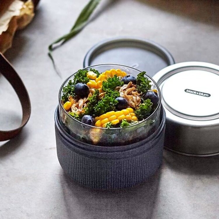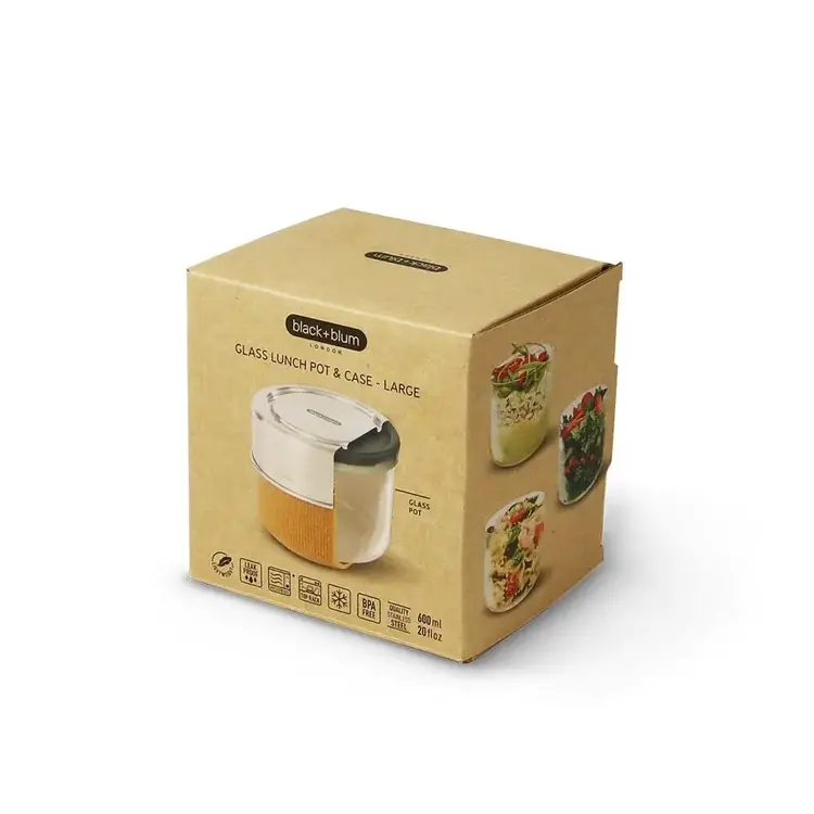 A lightweight 600ml Borosilicate glass bowl with a protective and insulating (keep cool) sustainably sourced wood fiber base and Stainless steel lid.