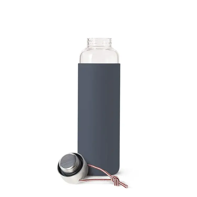 A 600ml Borosilicate glass bottle with a protective non-slip sleeve, convenient carry loop and stainless steel contact with water.