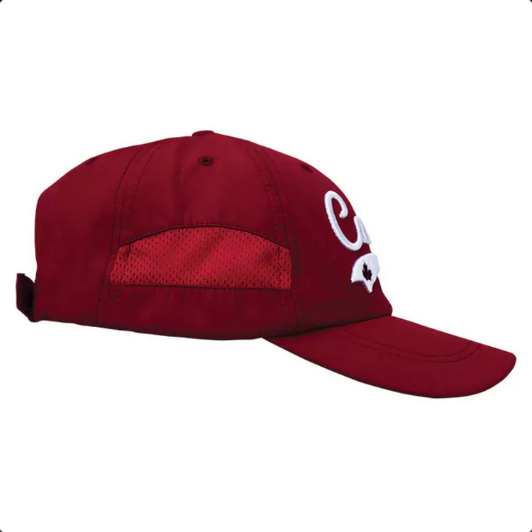 • One size. Bonded polyester. Mesh sides. Velcro Strap. Front Embroidery.