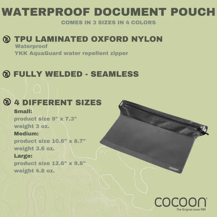 • This document pouch is the perfect way to keep your documents safe and dry. Made with 100% TPU-laminated Oxford Nylon, this pouch is durable and water resistant. The clear window allows for easy viewing of what's inside, while the snap closure keeps everything secure. Perfect for travel or everyday use, this pouch will make sure your documents are always within reach. Comes in 3 sizes.