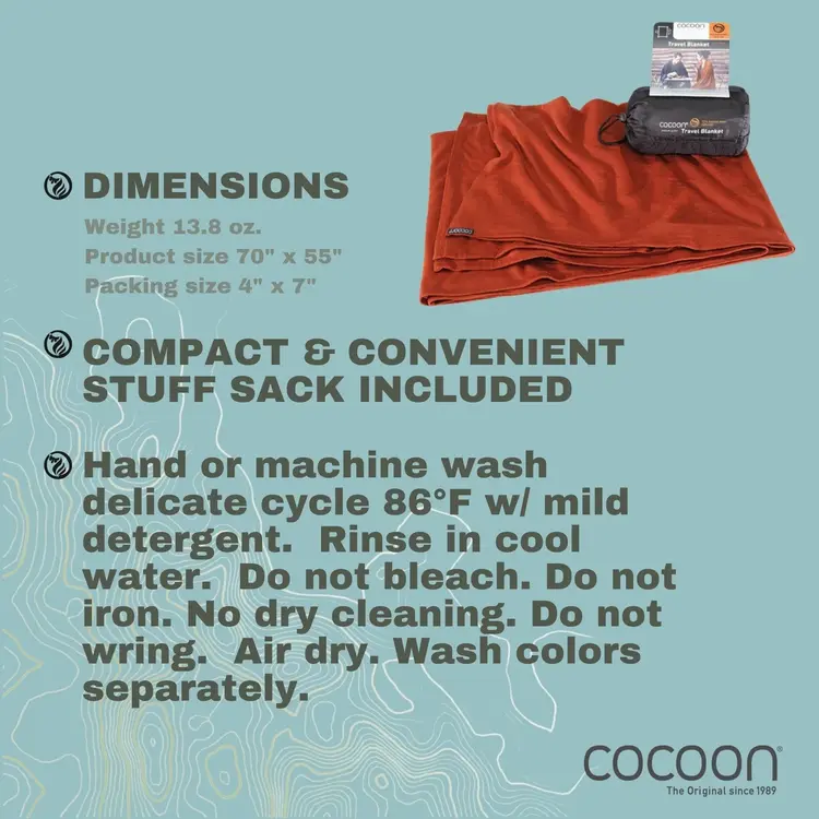 Indulge in the softness of the merino-silk fabric blend, which offers a heavenly touch against your skin. The blanket's generous dimensions of 70" x 55" ensure ample coverage, while its lightweight construction, weighing just 13.8 oz, makes it effortlessly portable. Each blanket comes with it's own compact stuff sack.