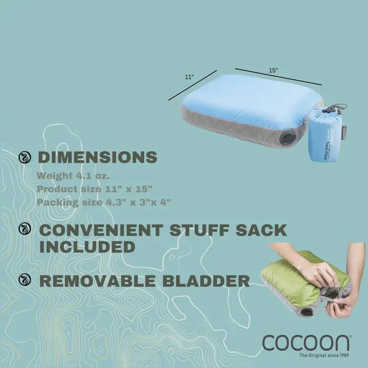 Ultra-lightweight, compact travel pillow with an inflatable, exchangeable air core underneath a layer of synthetic filling and a Microfiber/Nylon shell.