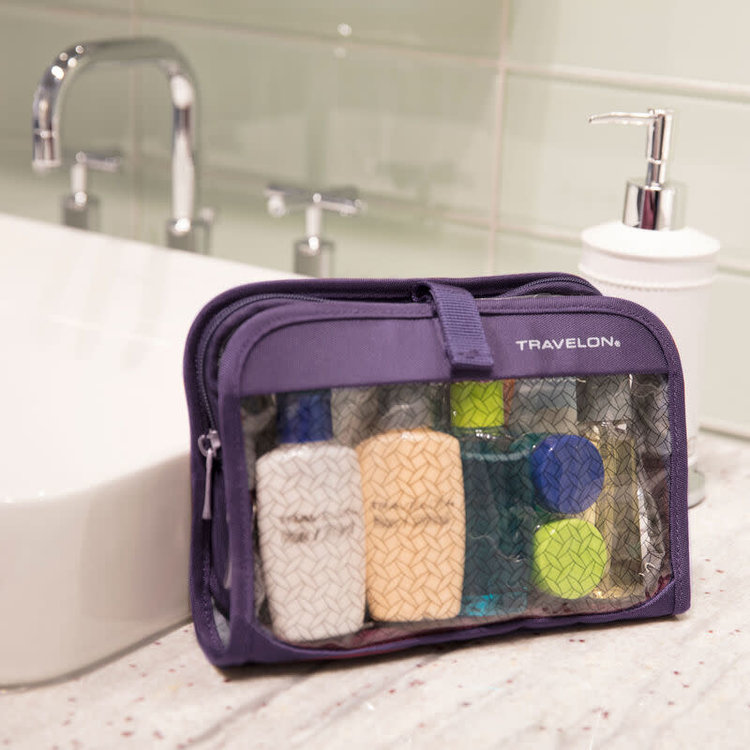 Thoughtfully designed to keep toiletries cleanly separated (with no cross-contamination between perfume and toothpaste) in a 2-compartment hanging bag that acts as safe zone in your suitcase to contain liquids and spills. TSA compliant 1-quart bag keeps liquids in a clear, easy-to-screen compartment, and non-liquid toiletries in a second clear compartment. Includes clear bottles, atomizer, and jars.
