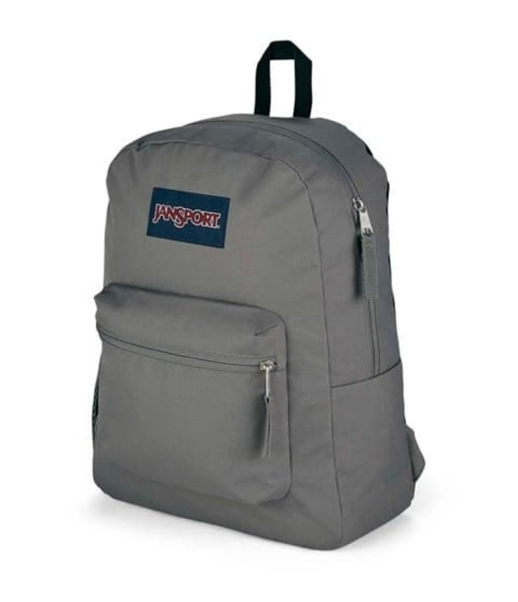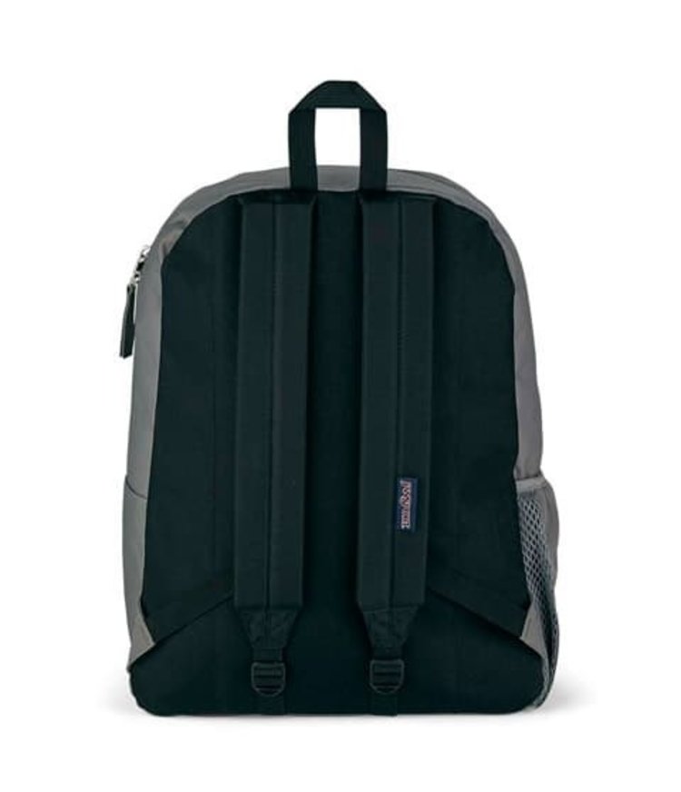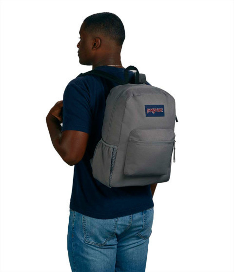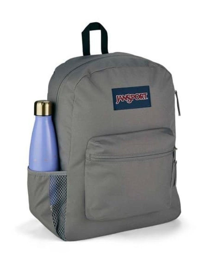 • The JanSport Cross Town Backpack Pack is constructed with 600-denier PU coated polyester material. A School or Commuter pack designed to carry everything you need for the day. A large main compartment with an internal laptop sleeve. 1587 cu in / 26 L storage space. A Front utility pocket with organizer. Straight-cut shoulder straps and padded back panel help ensure comfortable carrying. Mesh side water bottle sleeve for your favorite water bottle.