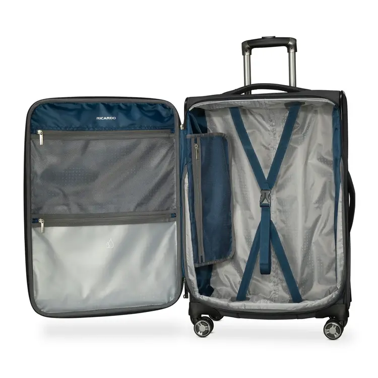 The PVC lined built-in wet pocket keeps your essentials dry and organized. 360 ̊ dual wheels make navigating through airports a breeze. Travel responsibly and conveniently with the Avalon luggage collection, where sustainability meets modern travel needs.
