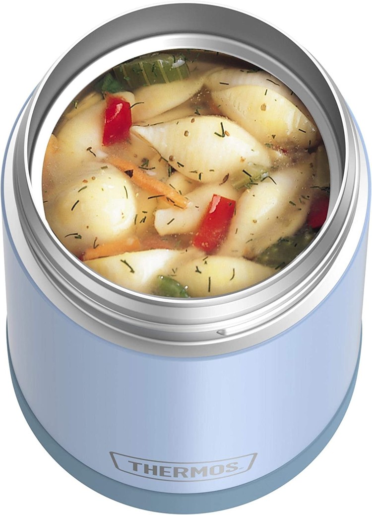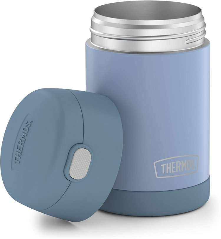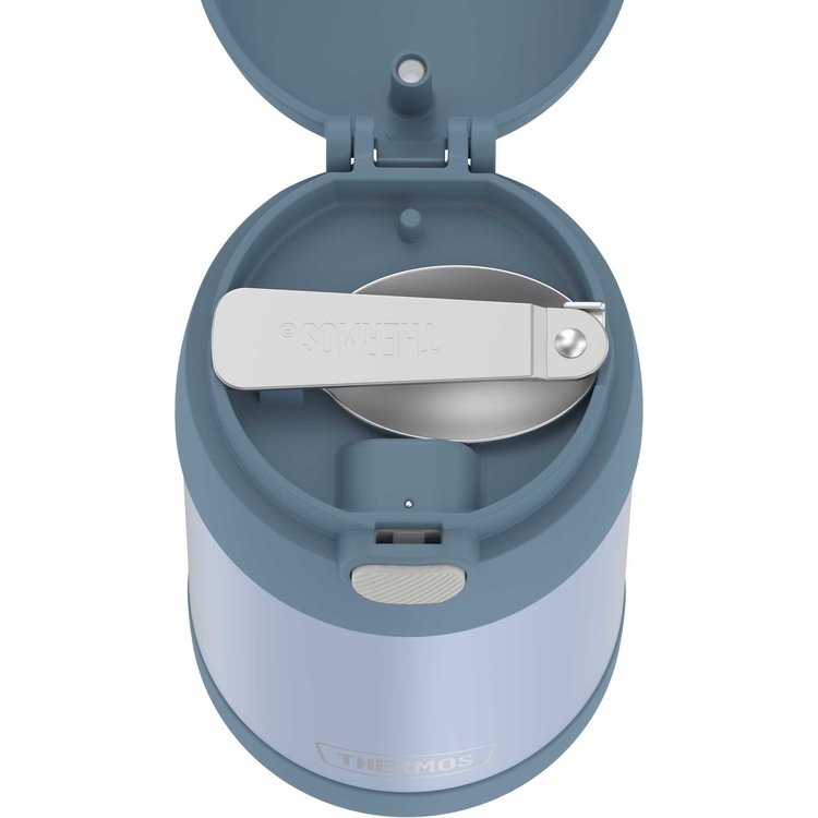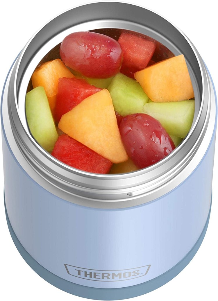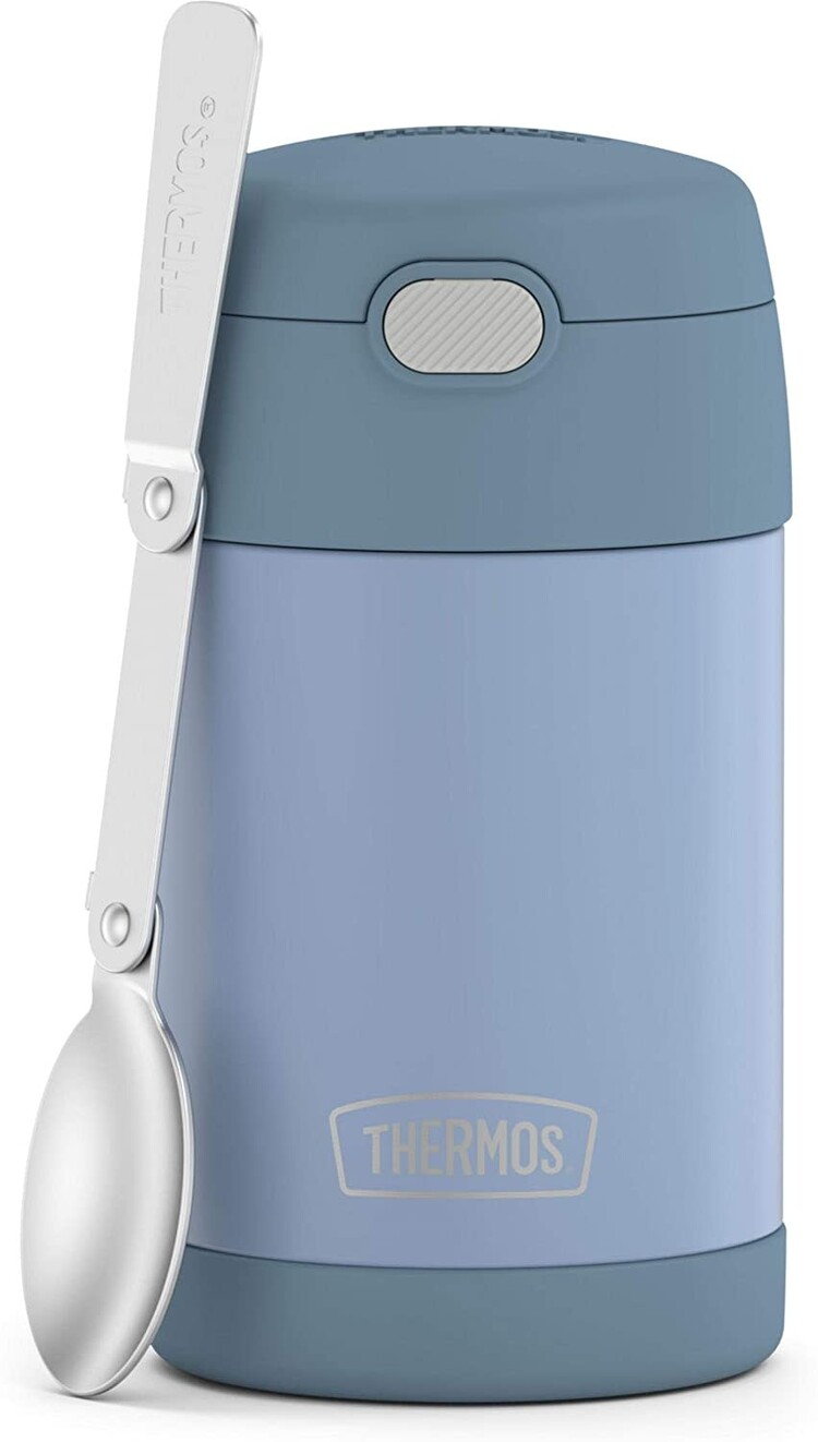 The 16oz FUNtainer® Food Jar from Thermos® brand is vacuum insulated to keep hot foods hot and cold foods cold-and since it's designed for kids it's also colorful and fun. Send them to school with their favorite soup so they can enjoy it fresh and hot at lunch time. If they're in the mood for a cold snack, pack it up with yogurt and berries, or apples and peanut butter. The FUNtainer food jar is light weight and compact with a push button lid so it’s easy to carry and open. To clean, you can pop your FUNtainer food jar in the dishwasher; however washing by hand is recommended. Spoon included.