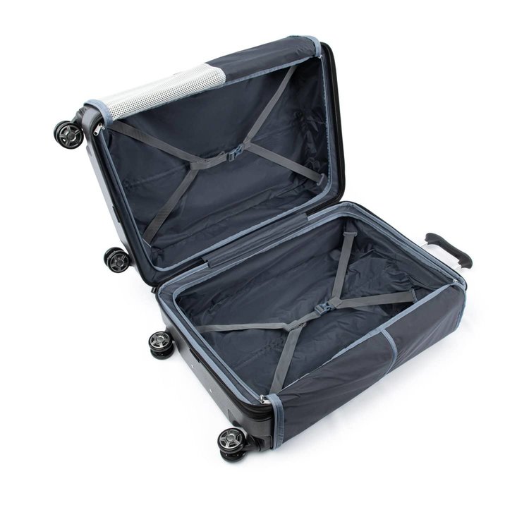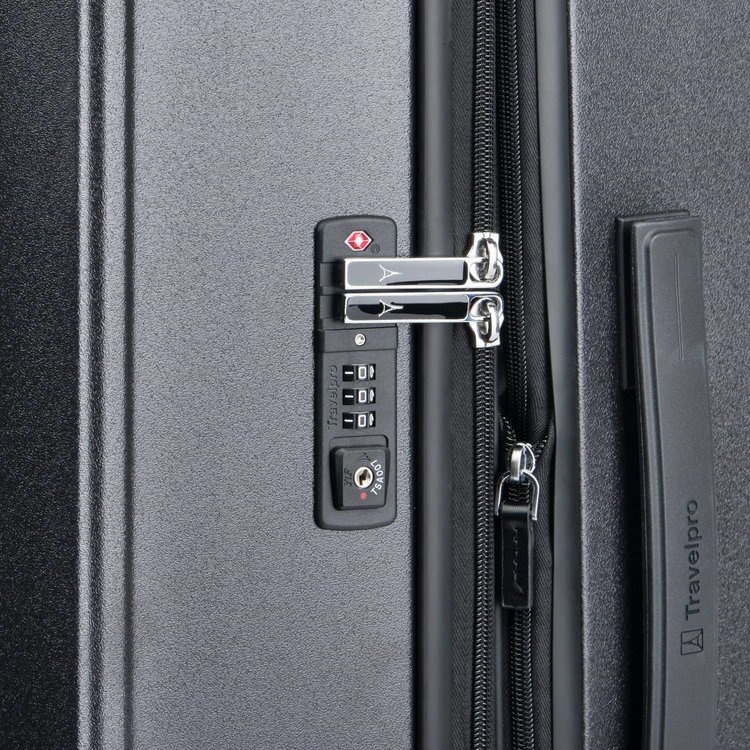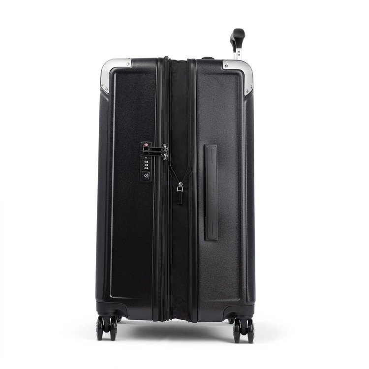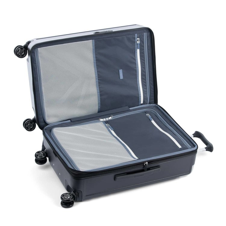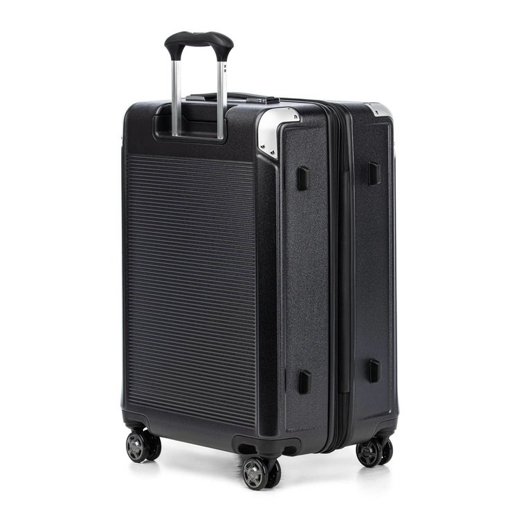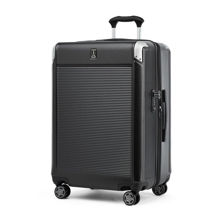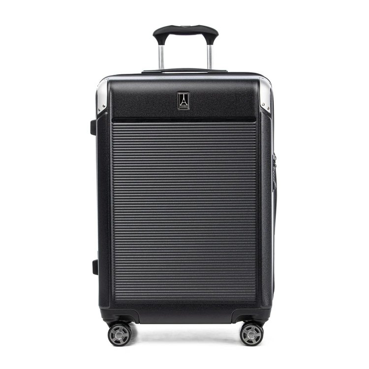 The Platinum® Elite Medium Check-in Expandable Hardside Spinner is the ultimate medium-sized hardside spinner. Ideal for medium and longer trips, it adapts to all your adventures.Durably constructed, it is built with an ultra-strong, easy-to-clean, 100% polycarbonate shell that flexes upon impact in order to prevent cracking and keep your belongings protected. The textured finish of the shell also helps to reduce the visibility of scuffs and scratches. Genuine leather details and aluminum corner armour give style and durability to this suitcase. A built-in lock allows TSA authorities to unlock and lock safely and securely if needed.Packing will be easy thanks to the two zippered divider panels that keep contents neatly organized and securely in place. Various pockets give you great organizational capacity and a water-resistant pocket will be perfect to store damp items or toiletries. This suitcase also has a zippered 2” expansion option that gives you extra packing capacity when needed.This hardside luggage is designed to help you go from point A to B with ease. With the Travelpro® exclusive PrecisionGlide™ System–eight MagnaTrac® self-aligning spinner wheels and the sturdy, four-stop adjustable PowerScope Lite handle with comfortable Contour Grip, you will be able to have precise control and effortless roll no matter where you go.
