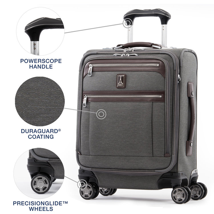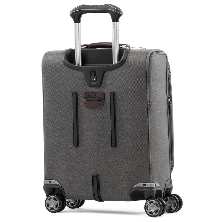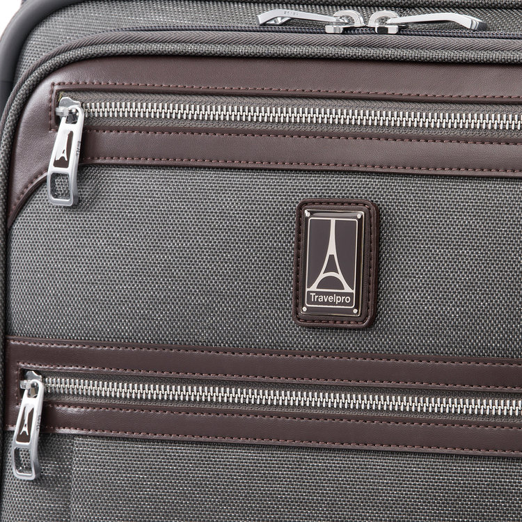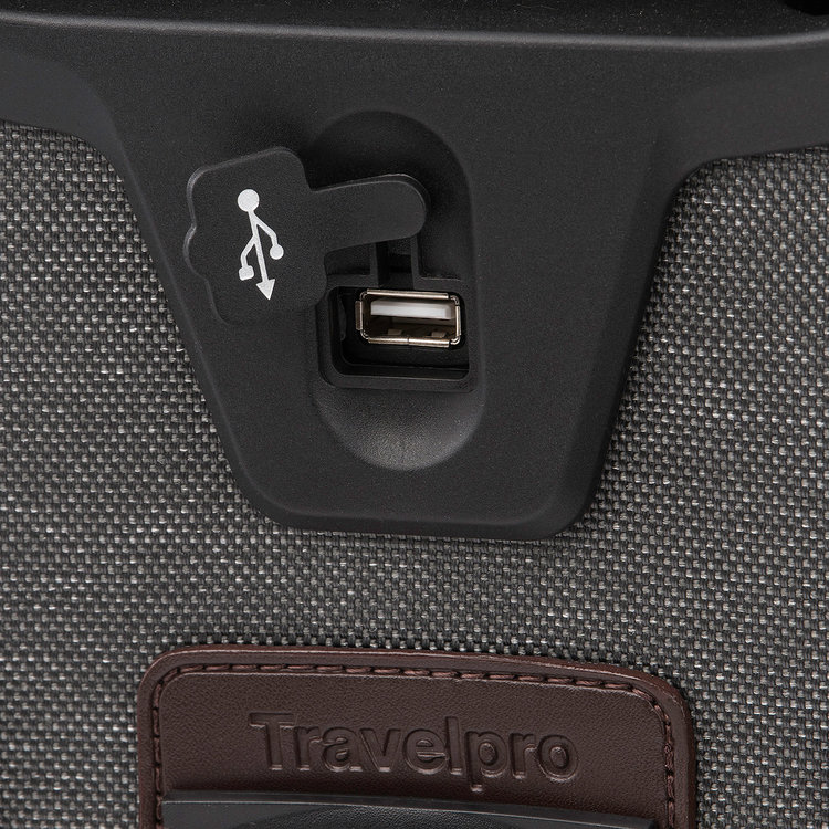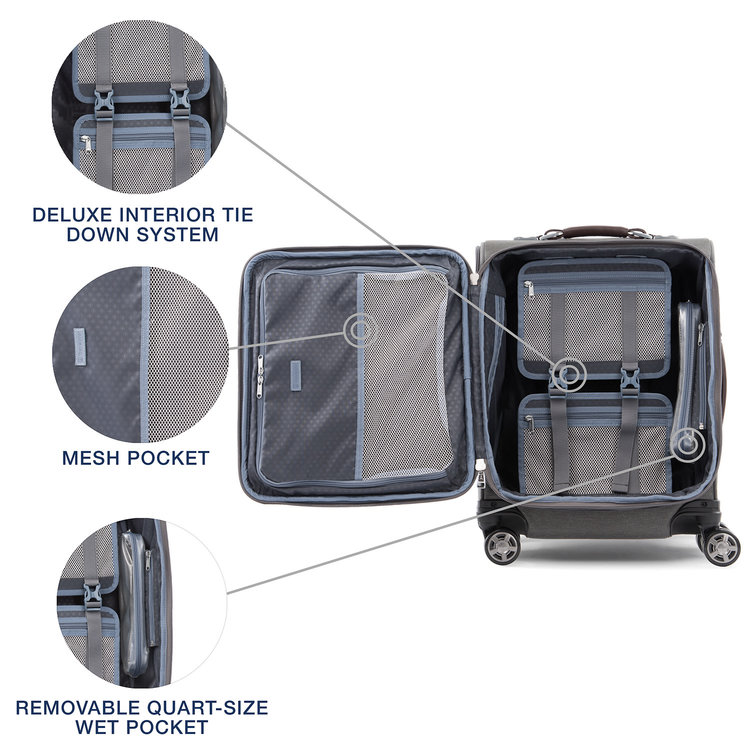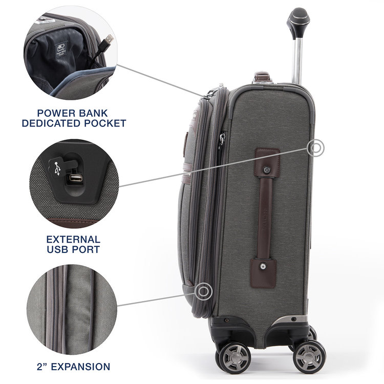 The Platinum® Elite International Expandable Carry-On Spinner is specifically designed to meet international airline standards for carry-on luggage. It also features a built-in, FAA-compliant USB port and dedicated back-up charger pocket to help stay connected on the go. Crafted in luxurious style with top-quality, stain-resistant fabrics, genuine leather trims and chrome zippers, this sturdy travel bag also comes with an expansion feature that can add up to 2 additional inches of packing space. On the inside, a deluxe tie-down strap system with easy-access accessory pockets keeps items organized and securely stowed, and a TSA-compliant, quart-size removable wet pocket is ideal for toiletries. For effortless mobility, this suitcase is also equipped with the PrecisionGlide™ system, comprised of eight MagnaTrac® self-aligning 360° spinner wheels, and an adjustable PowerScope extension handle with a patented, ergonomically-designed rubberized Contour Grip for easy handling.