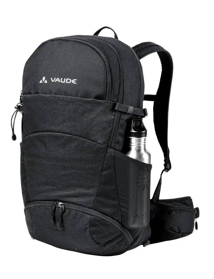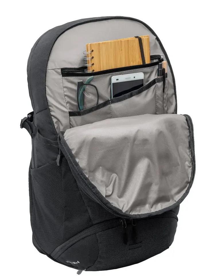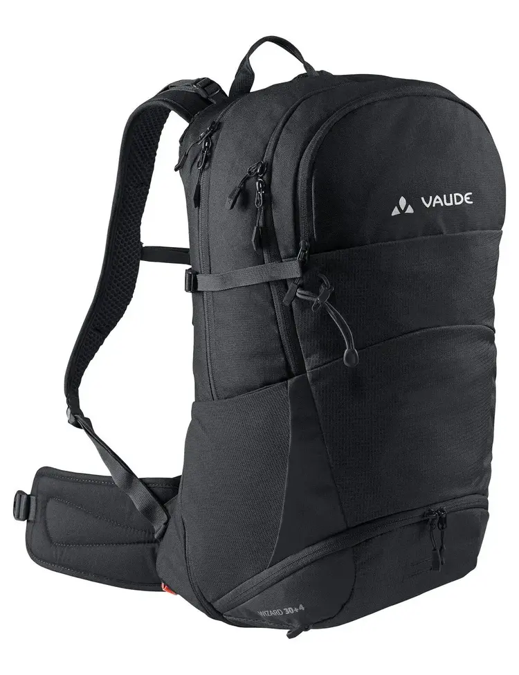 Fully adjustable, very spacious hiking pack for more comfort on your next hut-hopping or day trip in the mountains: The user-friendly Aeroflex Control suspension system keeps your back well ventilated during sweaty ascents and rides comfortably against your back on the way back down. The Shifting Back Length System also allows the back of the pack to be perfectly adjusted to your own torso size. An integrated zip volume extension and a practical organizer in the front pocket ensure flexibility and order. An additional floor compartment that's separate from the main compartment can be operated from the outside and stows wet rainwear or a change of clothes if necessary. This spacious pack is outfitted with external mesh pockets, a lid pocket, a hip belt pocket, hydration system compatibility and practical compression straps for versatile packing. The Wizard 30+4 was primarily made of recycled material and features environmentally-friendly Eco Finish water-repellency without fluorocarbons (PFC). The VAUDE Green Shape label stands for environmentally-friendly, functional products made from sustainable and bluesign® certified materials.