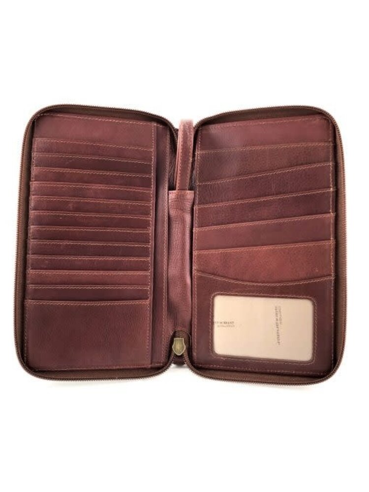 All leather passport wallet with 15 card slots. Plenty of room for currencies as well as boarding passes and passports. Very secure with a wrist strap and full zipper.