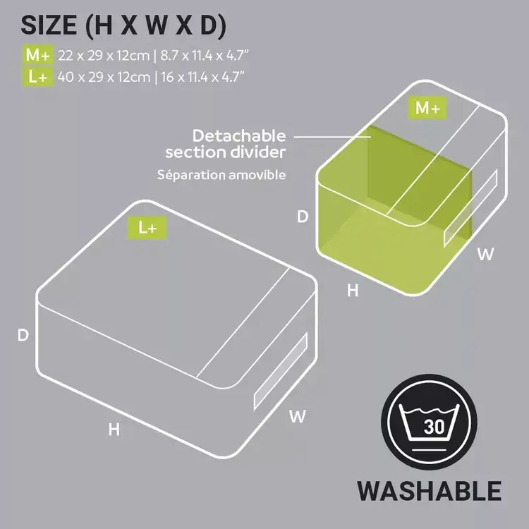 • 2 piece set, Size M+ (H x W x D) 22 x 29 x 12cm | 8.7 x 11.4 x 4.7" Size L+ (H x W x D) 40 x 29 x 12cm | 16 x 11.4 x 4.7"