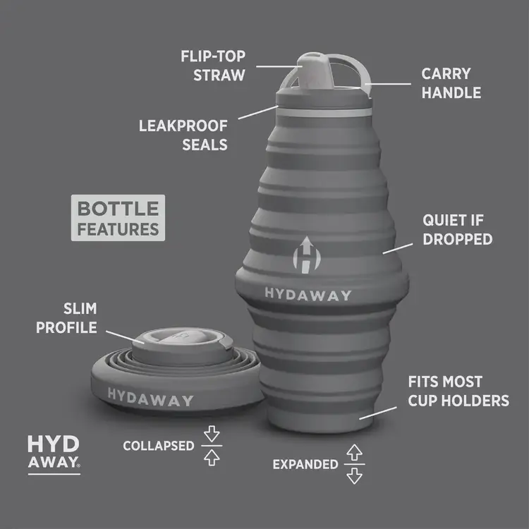 • Meet HYDAWAY. The collapsible, ultra-stashable, planet-friendly, go-anywhere way to stay hydrated.
