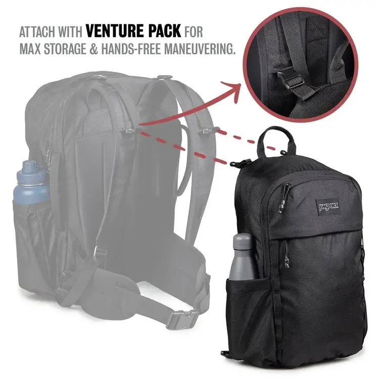 • Consider everyday journeys handled with Venture Daypack. Secure necessities in the large main compartment and laptop sleeve. Keep H2O in dual side pockets. For longer adventures, attach to the larger Venture Pack.