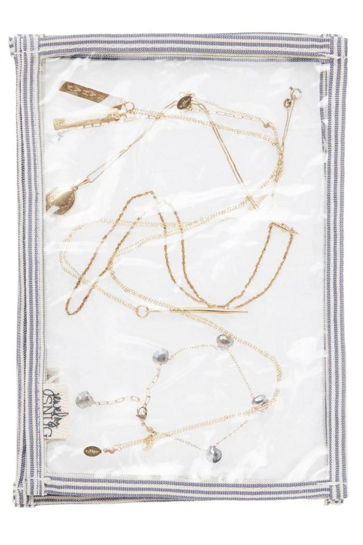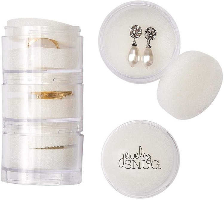 The perfect solution for traveling with jewelry tangle free! How does it work? You place your jewelry between the two sheets of cling vinyl, press firmly, and voila! Your jewelry will stay in place tangle free. You can then place earrings and rings into the included stacked cylinder. Place the cylinder on top of your vinyl pages, roll and put into the drawstring pouch. As simple as that and a true solution!