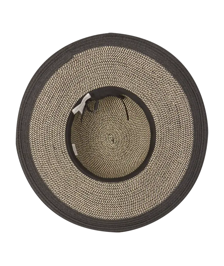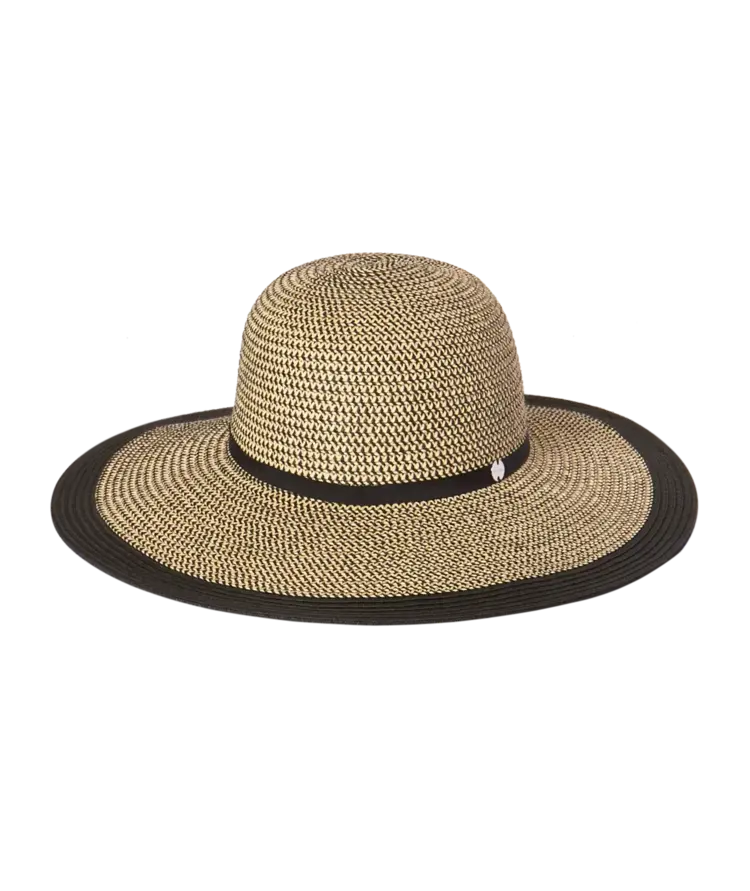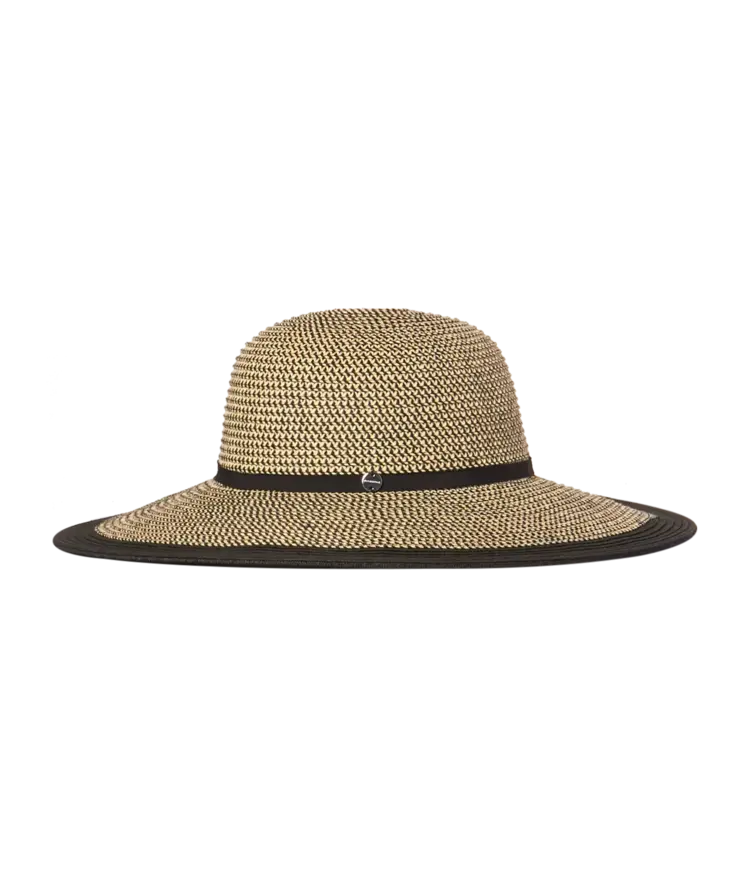 A stylish fashion wide brim with a gorgeous braid finish. Subtle black tones trimmed with black ribbon. Perfect for the beach or a lunch in town, this classic wide brim is a must for every summer wardrobe.