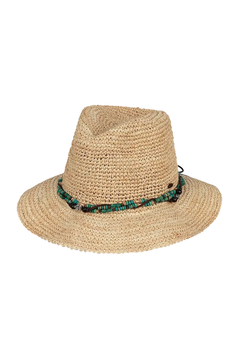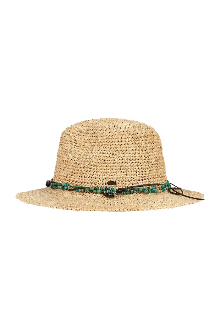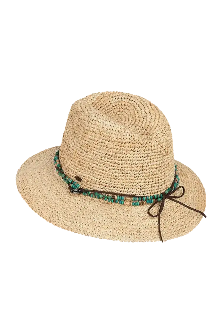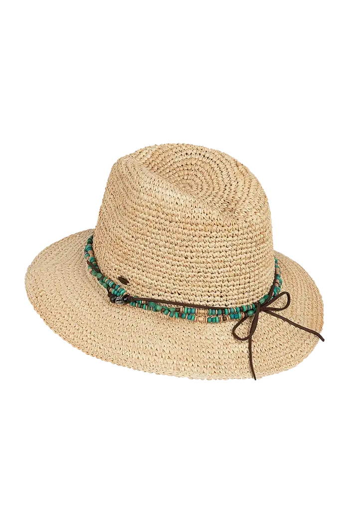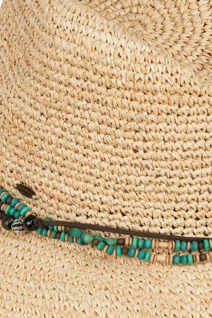 Handmade from raffia straw, the Bora Bora is all relaxed charm and sun-smart function. Its beaded and faux leather crown band, coconut logo badge, and elastic sweatband offer comfort and character.