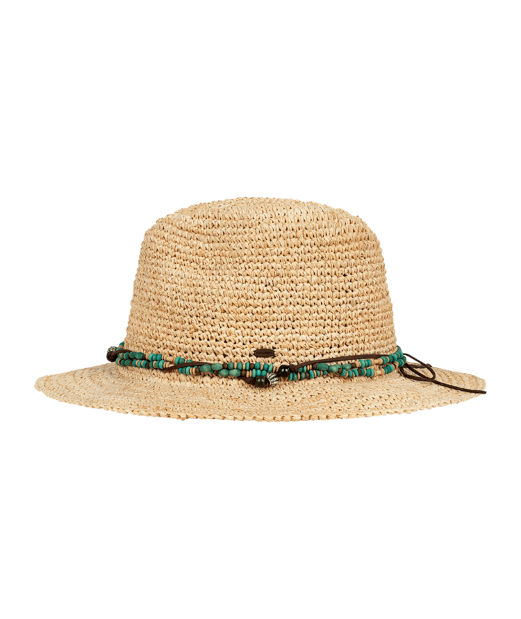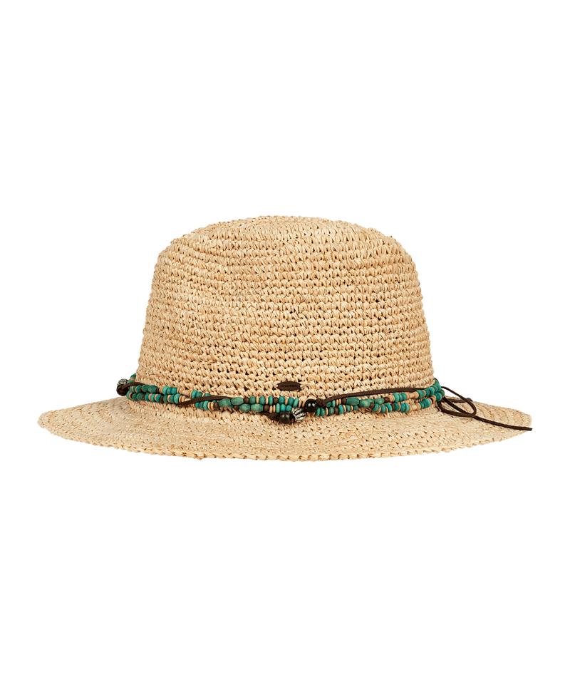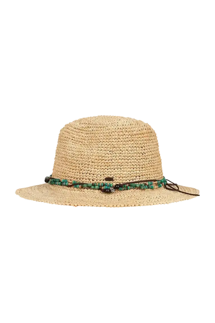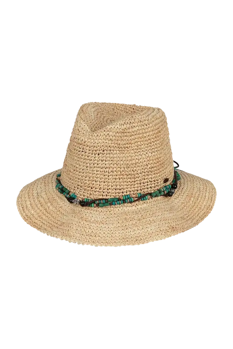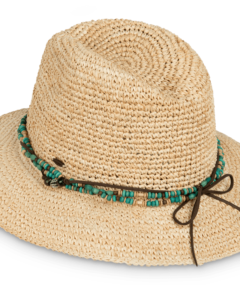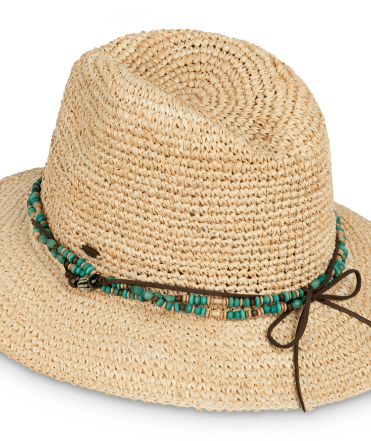 Handmade from raffia straw, the Bora Bora is all relaxed charm and sun-smart function. Its beaded and faux leather crown band, coconut logo badge, and elastic sweatband offer comfort and character.