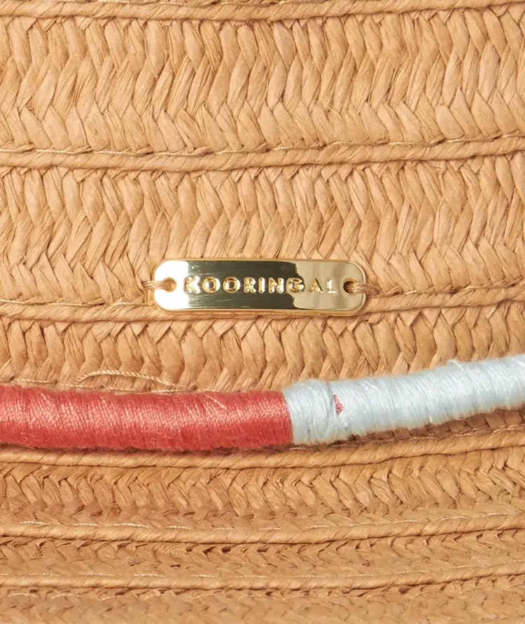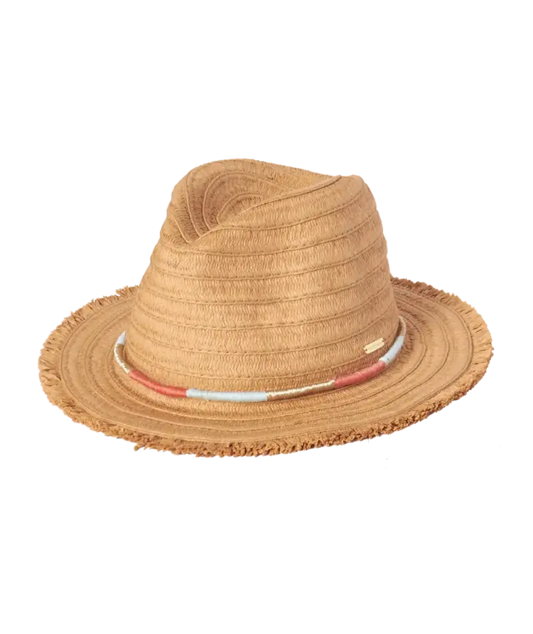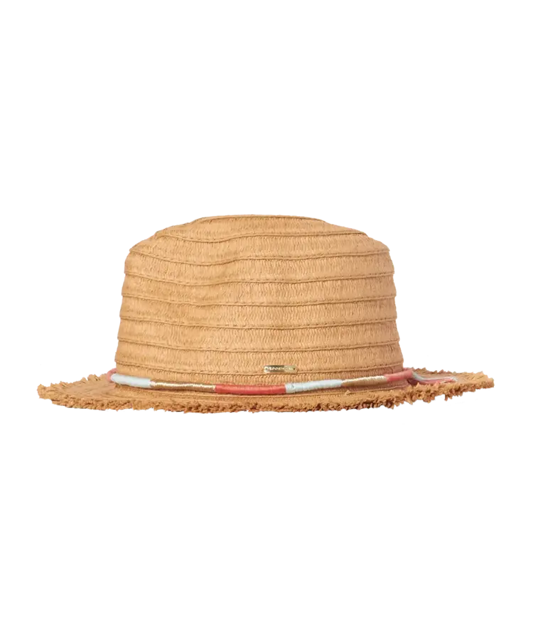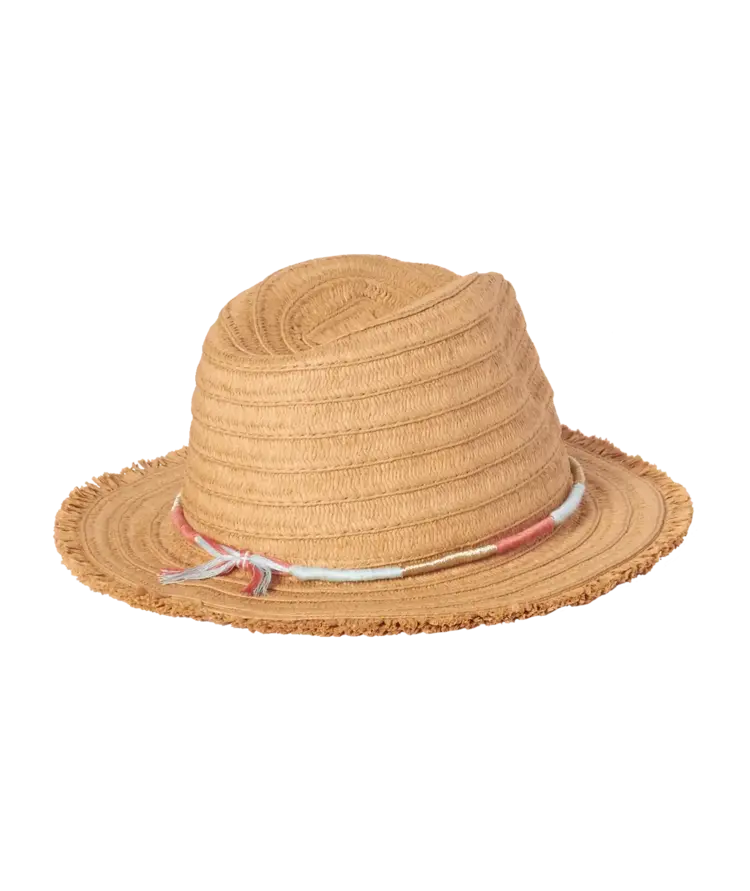 Youthful frayed edge safari hat with colorful twisted cotton accent.