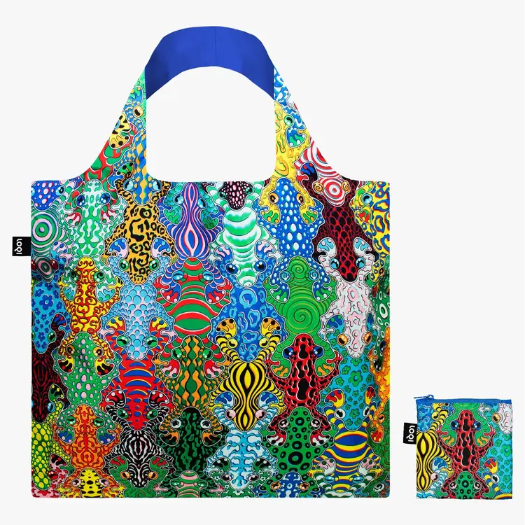 This vibrant recycled bag features SAM WILDE'S Equi– pattern—a kaleidoscopic array of colorful frogs in mesmerizing, symmetrical formation. Each frog bursts with bold stripes, spots, and psychedelic details in neon brights and high–contrast hues. The design radiates playful energy and transforms nature into striking pop art. On view at the Young V&A © Sam Wilde