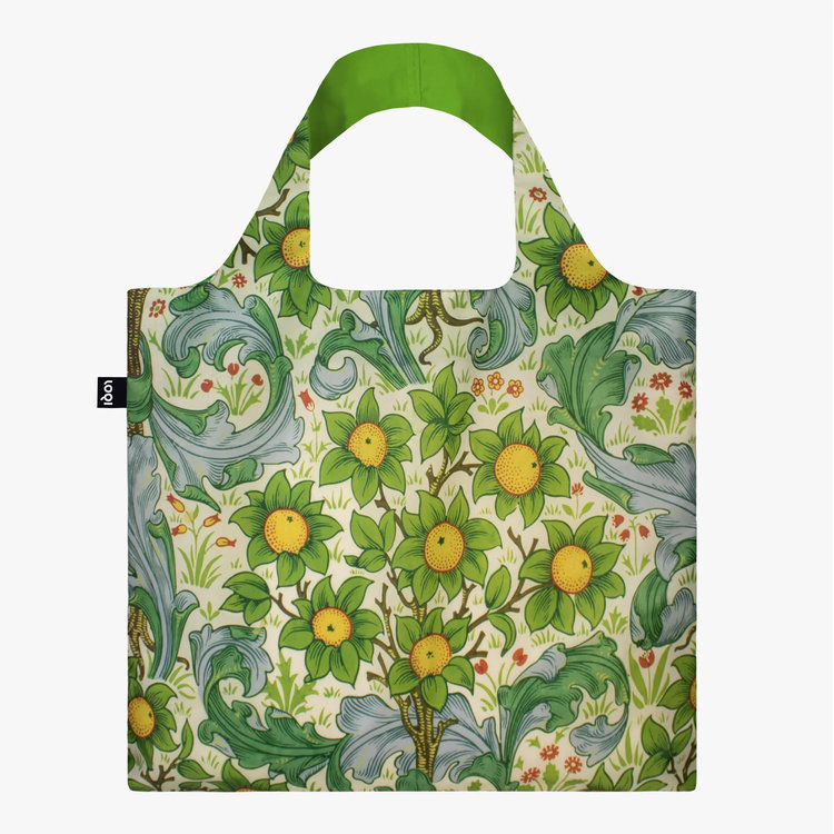 Soft blue. Green acanthus leaves. Small orange trees. Makes you only want to dive into the exquisite colour palette of the Orchard Dearle by William Morris recycled tote bag.