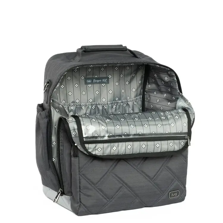 • Ready for your next adventure? The Ranger XL 2 Duffel Bag is your ideal travel companion, blending style and functionality for all your vacations and getaways. With front quilting and a trendy charm bar, it features a soft-lined phone pocket with a magnetic closure, two magnetic side pockets, and a luggage trolley sleeve for effortless transport. Inside, a built-in RFID wallet securely holds six cards, while a key ring bungee cord, two pen holders, a Clearview zipper pocket, and multiple cargo pockets keep everything organized. Equipped with a top handle, a back zipper pocket, and a durable design, the Ranger XL is perfectly prepared for all your packing needs!