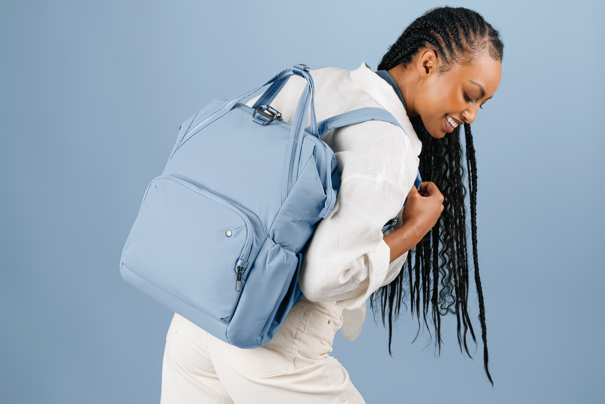 Our best-selling women’s anti-theft bag now in ECONYL® regenerated nylon. Ultra-chic, versatile and practical, the spacious Citysafe® CX 17L Backpack has space for a 16” laptop, offers smart organisation for your things, and protects your valuables with security that blends into the stylish design.