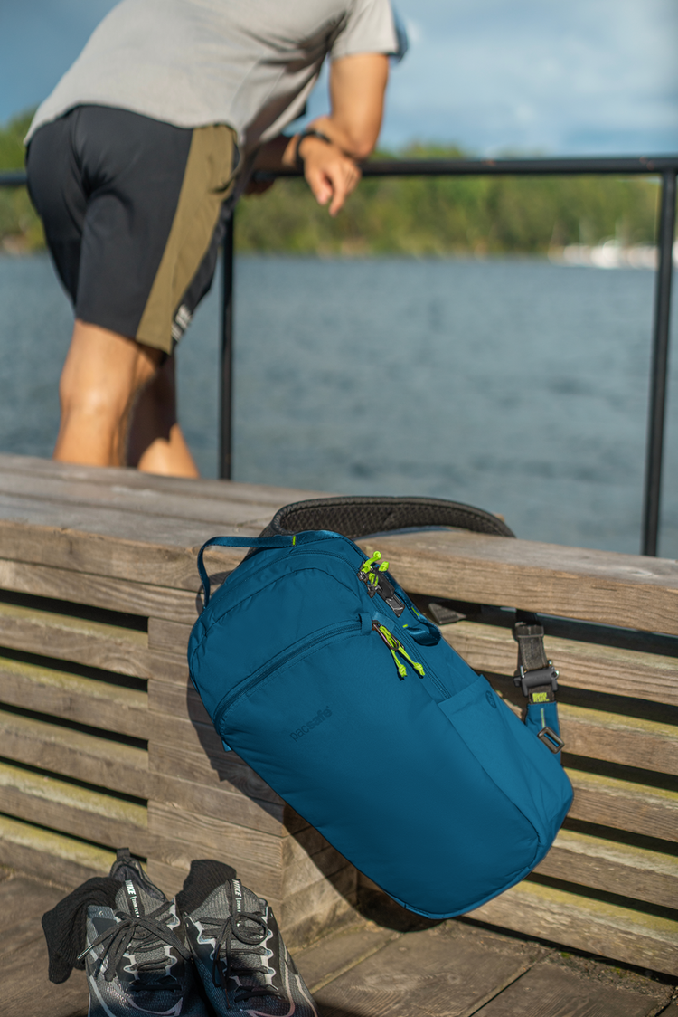 The Pacsafe ECO collection is our most sustainable collection yet by using almost 100% recycled materials and components. Get off the beaten track with this spacious sling pack that's designed for the outdoors, bike rides, traveling and more. The ergonomically-designed shoulder strap offers better support and carrying comfort. There's sufficient room to pack the essentials, including two water bottle pockets and a space for a water bladder. For extra comfort, choose which side you want the shoulder strap with our ambidextrous design. To minimize movement of the bag on your body while you're on the move, use the three-point attachment by connecting the body strap to the shoulder strap. Made with 8 recycled plastic bottles, which were used in the lining, mesh, webbing, and labels. The outer shell fabric and certain buckles were made with ECONYL® regenerated nylon, which comes from waste such as discarded fishing nets, fabric scraps, carpets and industrial plastic.