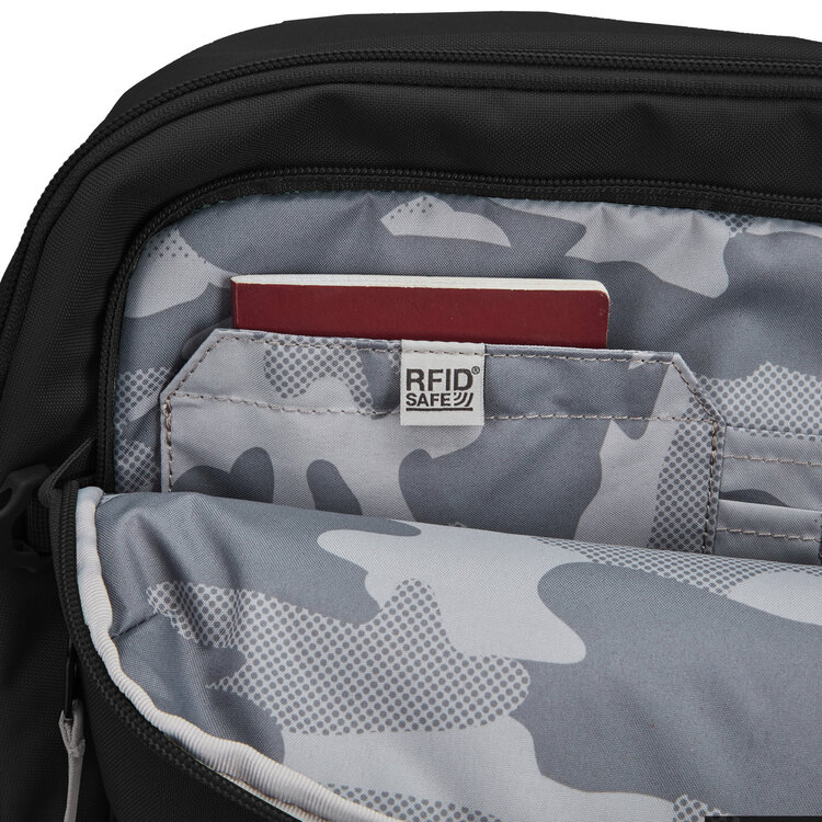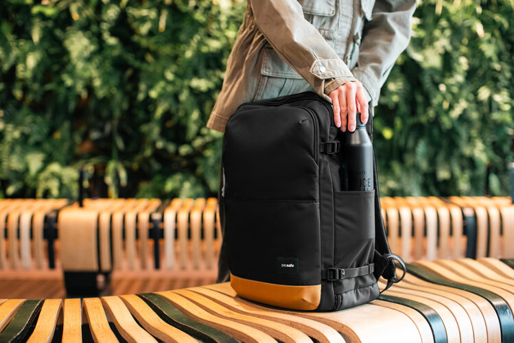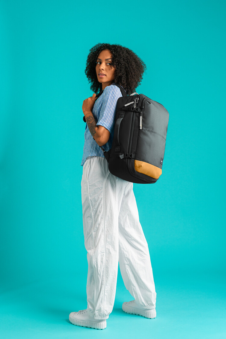 With 34L of capacity, this backpack offers enough storage for spontaneous travels but it's also suitable for day-to-day use. The lockable main compartment can open up like a suitcase for easy packing and access. There's also a sturdy side handle so it can be carried like a suitcase and side compression straps to help stabilize the bag when it's not full. Keep your travel documents and essentials that you frequently reach for in the conveniently placed outer pocket, secured with an easy to use zip tab to deter pickpockets. This product is made with post-consumer recycled polyester (rPET), equivalent to 28 recycled plastic bottles.