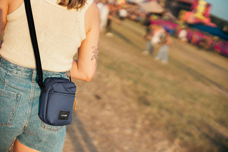 For those moments you prefer going hands-free with just the essentials, this micro-size crossbody will fit just that. This compact crossbody has two perfectly sized compartments that will fit your phone, wallet, keys, sunglasses, and AirPods. It's all secured with easy lockable zippers, an RFID-blocking pocket, and a cut-resistant strap to help protect your valuables while you're on-the-go. This product is made with post-consumer recycled polyester (rPET), equivalent to 5 recycled plastic bottles.