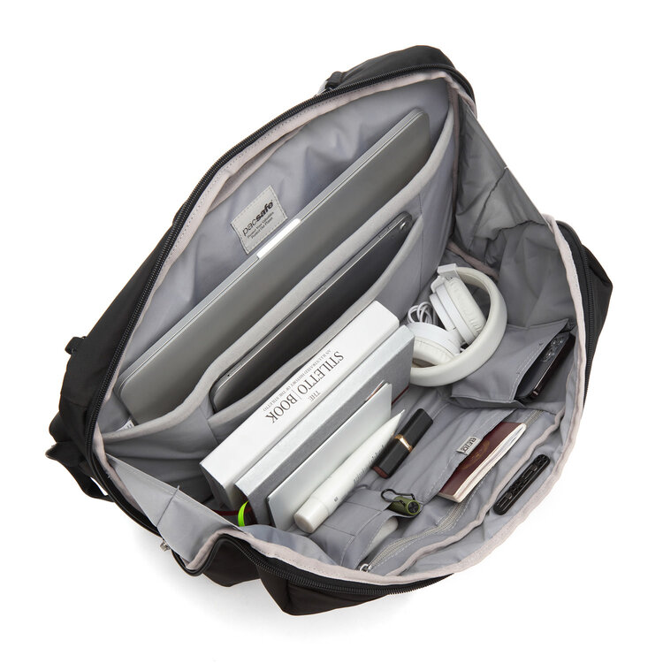 • The slim profile allows for easy movements through busy areas such as subways, city streets and the airport, making it the perfect companion for city dwellers and commuters. The 18L capacity of this anti-theft backpack holds more than you think, with separate padded compartments for a 16" laptop and 10" tablet, and several internal pockets for your gadgets, cables and on-the-go gear. The unique sideways wide opening also makes it very easy for you to access your belongings with minimal hassle. Not only is the bag packed with function, it's packed full of Pacsafe security features.