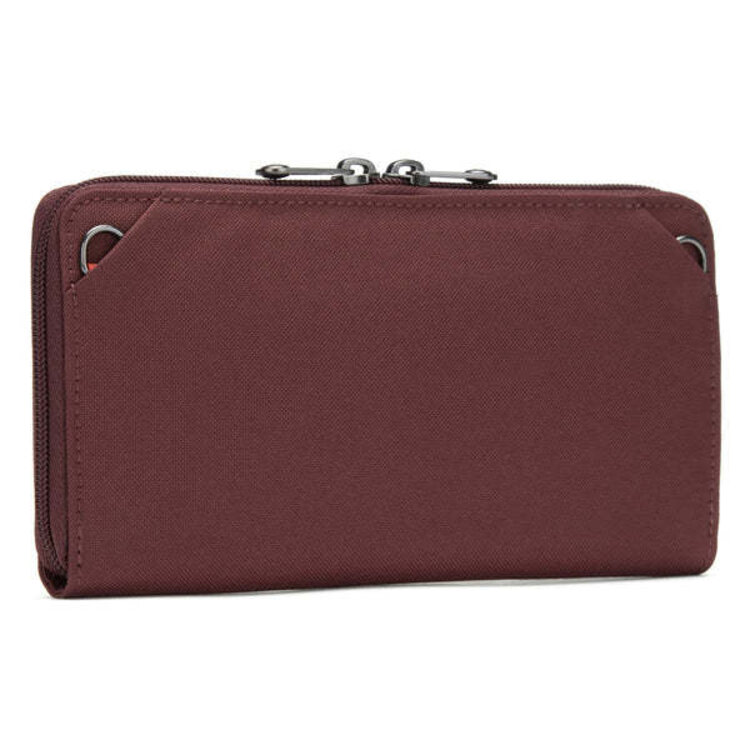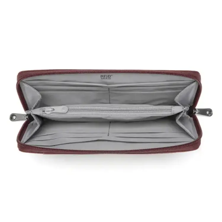 This convenient zip closure wallet was designed to securely carry your passport, boarding pass, phone, up to 10 cards, and cash. For added security, it features a hidden pocket where you can store important cards or high-value bills. Rest assured, every pocket is protected by RFID-blocking materials, ensuring protection against unauthorized scans. Carry it your way! With our customizable wallet, you have the freedom to transform it into a compact crossbody or wristlet in an instant. Simply attach a different security strap and personalize your wallet experience.
