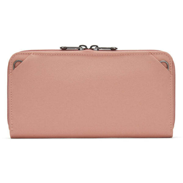 This convenient zip closure wallet was designed to securely carry your passport, boarding pass, phone, up to 10 cards, and cash. For added security, it features a hidden pocket where you can store important cards or high-value bills. Rest assured, every pocket is protected by RFID-blocking materials, ensuring protection against unauthorized scans. Carry it your way! With our customizable wallet, you have the freedom to transform it into a compact crossbody or wristlet in an instant. Simply attach a different security strap and personalize your wallet experience.
