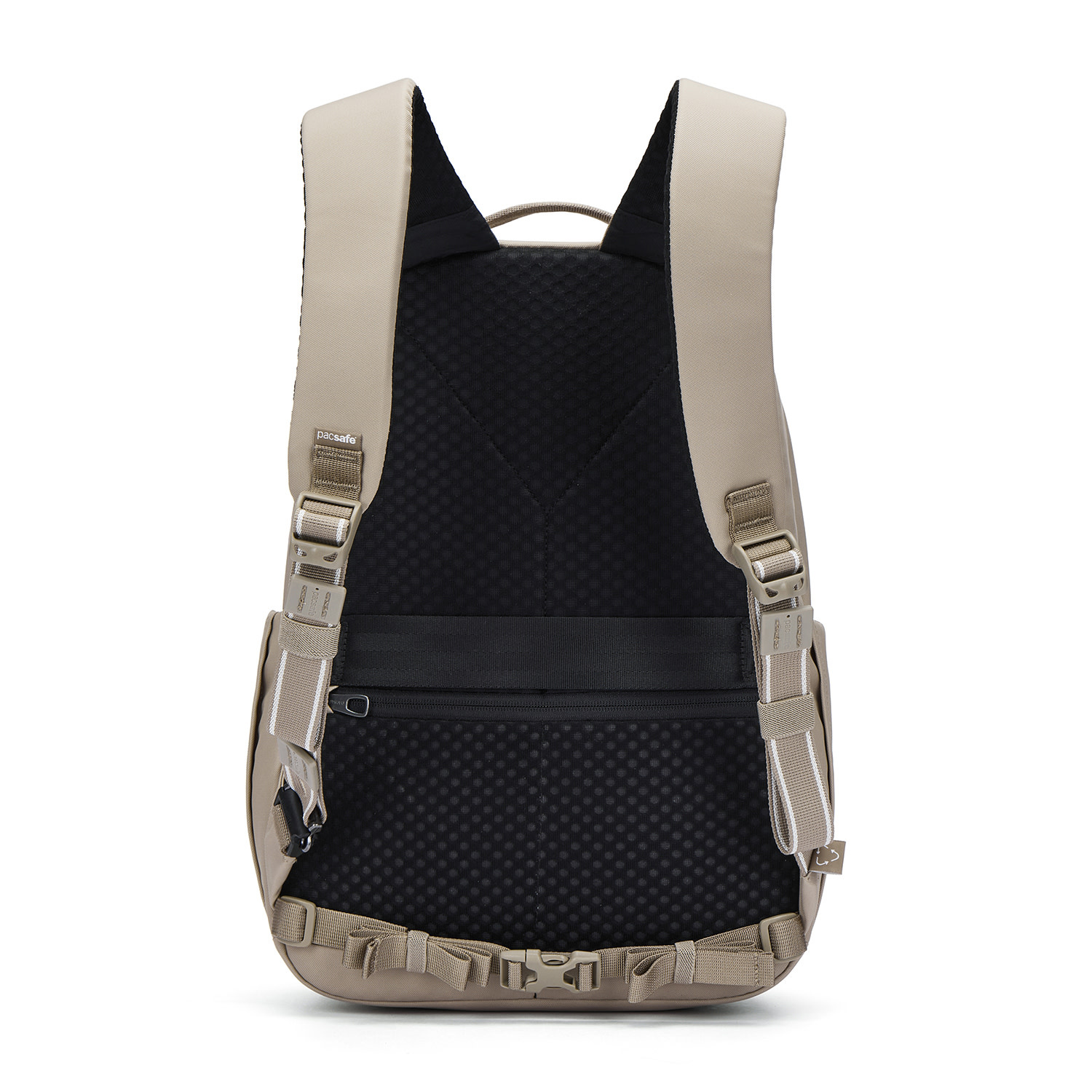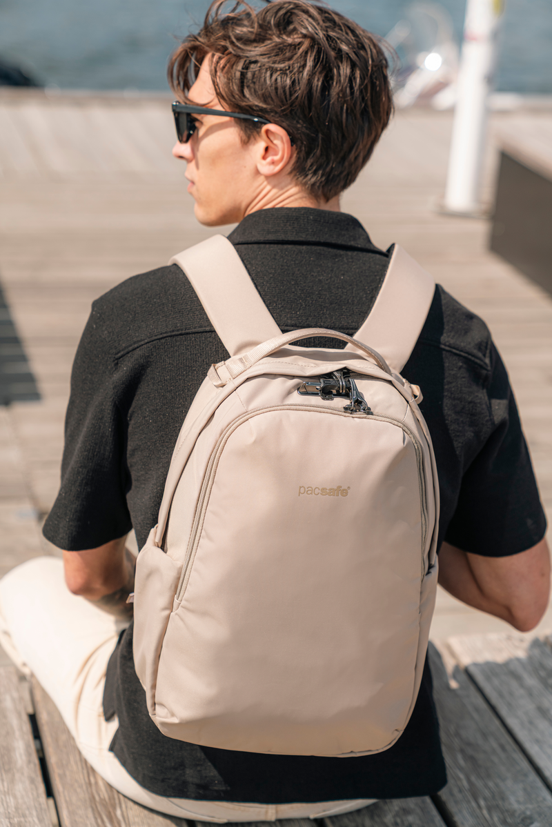 Compact yet highly organized, this 16L anti-theft backpack is designed to securely carry your day trip essentials. It features two lockable compartments, each equipped with internal organization pockets to ensure everything stays neatly arranged. Additionally, the backpack includes a padded laptop sleeve designed to accommodate a 13" MacBook, providing extra protection for your device. For added convenience, the backpack includes a hidden pocket on the back to safely store important items such as your phone, providing easy access whenever needed. It also features a luggage slip, allowing you to securely attach the backpack to the handle of your wheeled luggage.