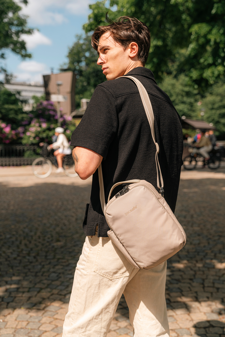 Carry all your essentials and more with this anti-theft crossbody that offers ample storage space. It is the perfect sidekick for trips around the world or everyday use. The two lockable compartments feature built-in organizational pockets, while a dedicated padded sleeve ensures a secure fit for an 11-inch tablet. Additionally, there's a discreet hidden pocket on the back, providing an extra layer of security for your valuables. Keep a reusable water bottle or a small umbrella easily accessible in the convenient expandable pocket on the side.