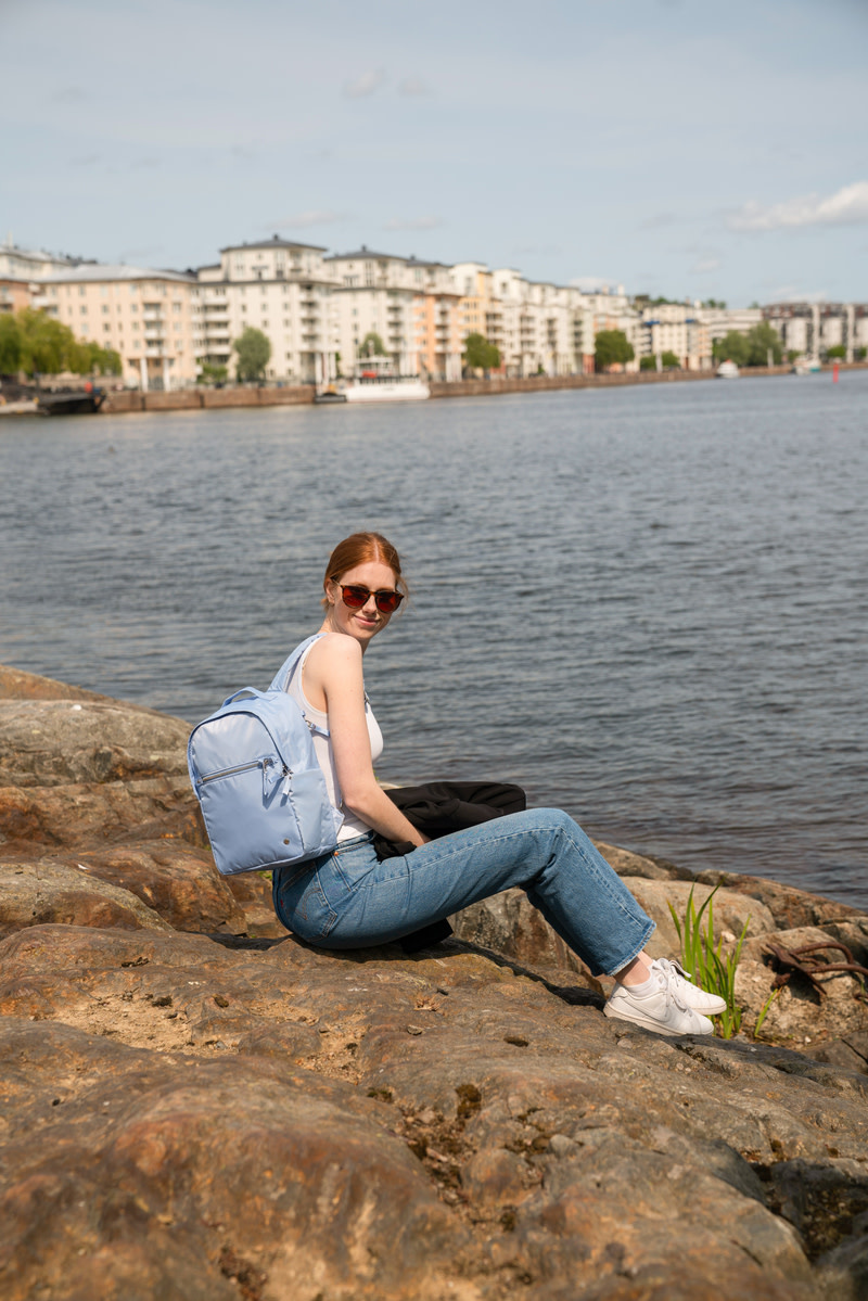 This anti-theft backpack is thoughtfully designed to cater to the needs of modern travelers on the go. Discretion and functionality are key features of this backpack. The secure and separate laptop compartment, designed to fit a 13-inch MacBook, ensures a safe and hassle-free transit through airport checkpoints. The spacious front compartment offers ample room to store all your essentials, from notebooks and chargers to a makeup bag and more. Plus, there's a large RFID-blocking pocket dedicated to accommodating longer wallets. With enhanced anti-theft technology, including cut-resistant materials, lockable zippers, RFID-blocking features, and a detachable anchor strap, this backpack ensures the utmost protection for your belongings.
