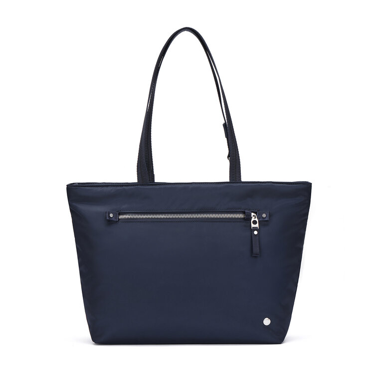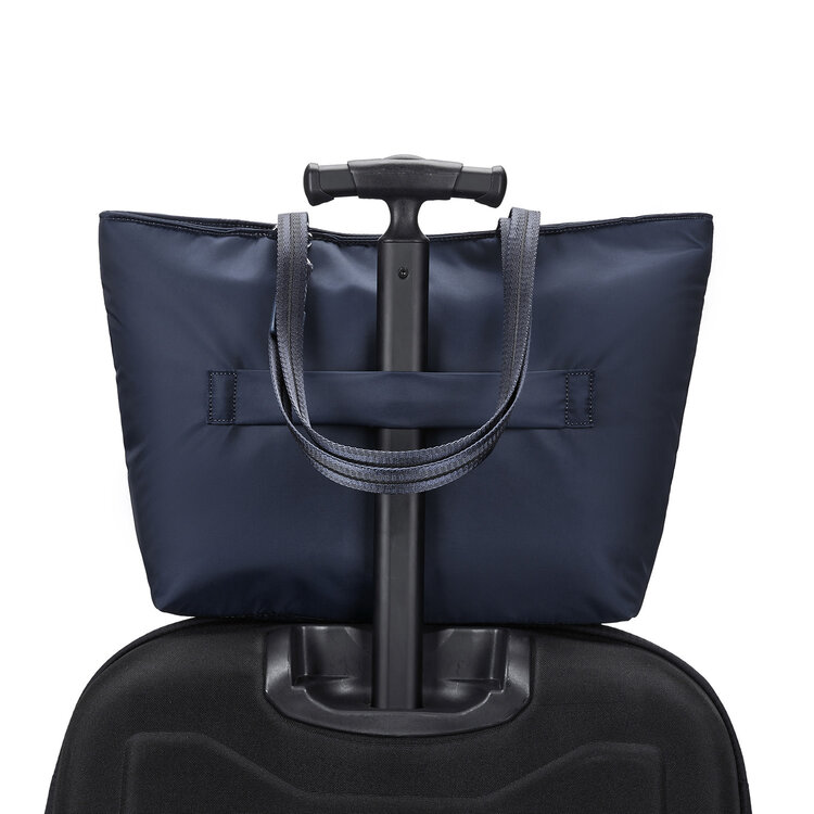 • This spacious tote offers a refined, minimalist style, perfect for travel, work, or any situation requiring ample storage. Featuring a padded laptop compartment for secure tech storage, a luggage slip for easy transport, a front compartment for quick access, a spacious zippered RFID blocking pocket, various organizational pockets for your phone, pens, portable charger, and more. Discreet anti-theft features are integrated into the tote to provide you with peace of mind.