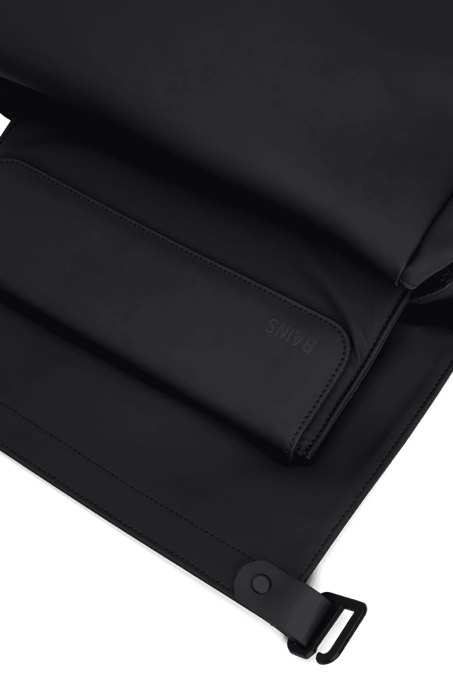The front flap secures with c-clips, while a magnet-locked main compartment reveals a padded 16" laptop sleeve, two slip pockets, and a mesh side pocket. A slimline detachable pouch keeps small tech or documents in check. For quick access, a separate zip-entry laptop pocket is integrated into the back panel.