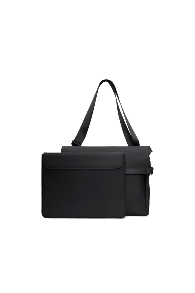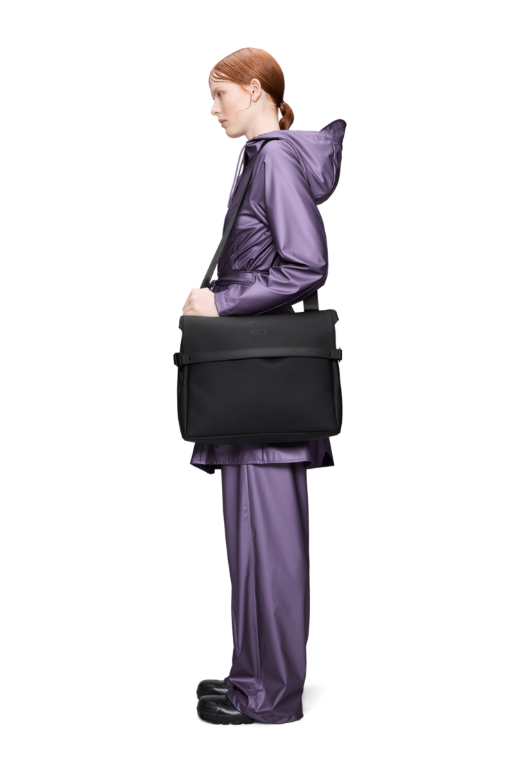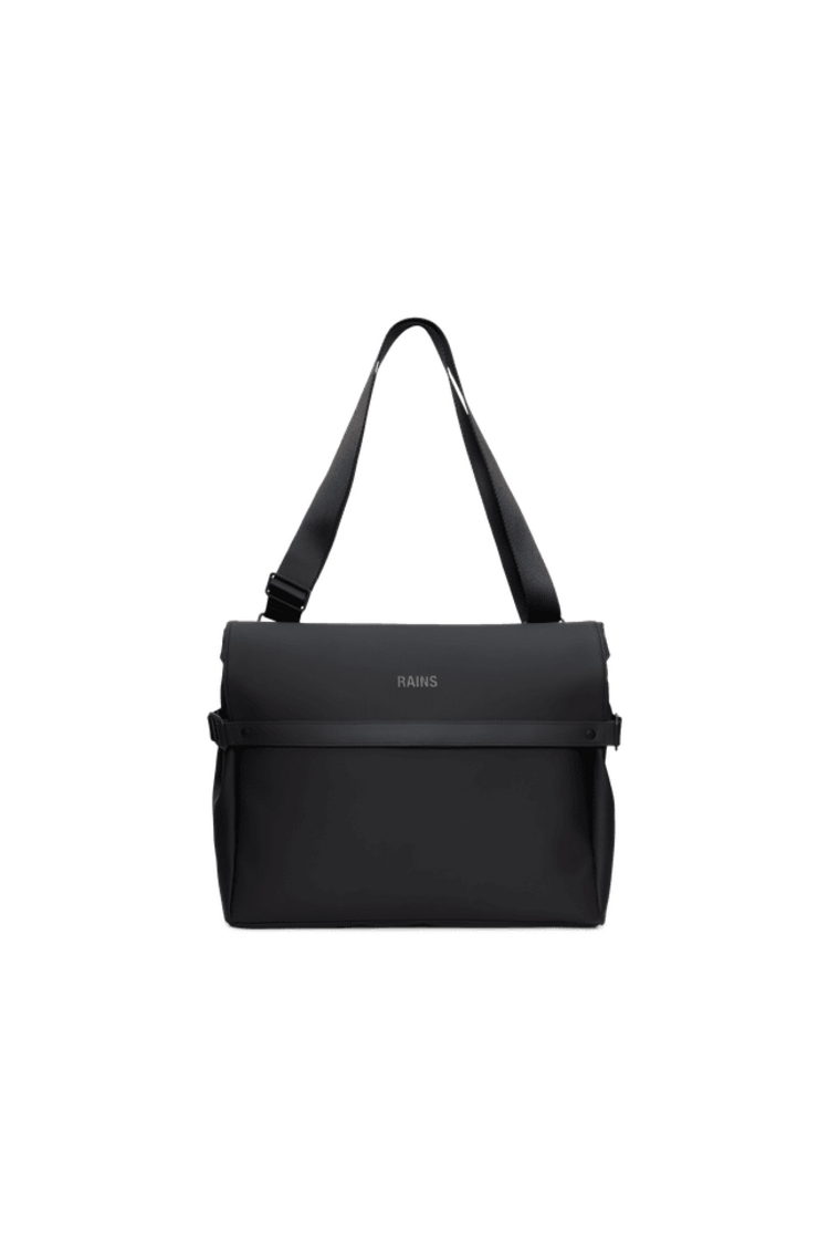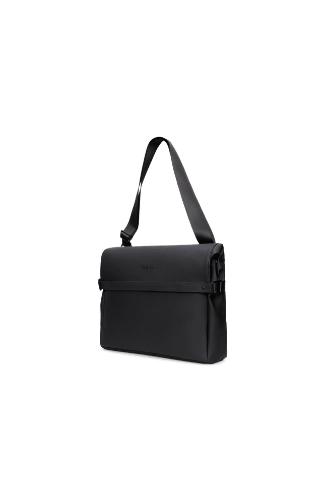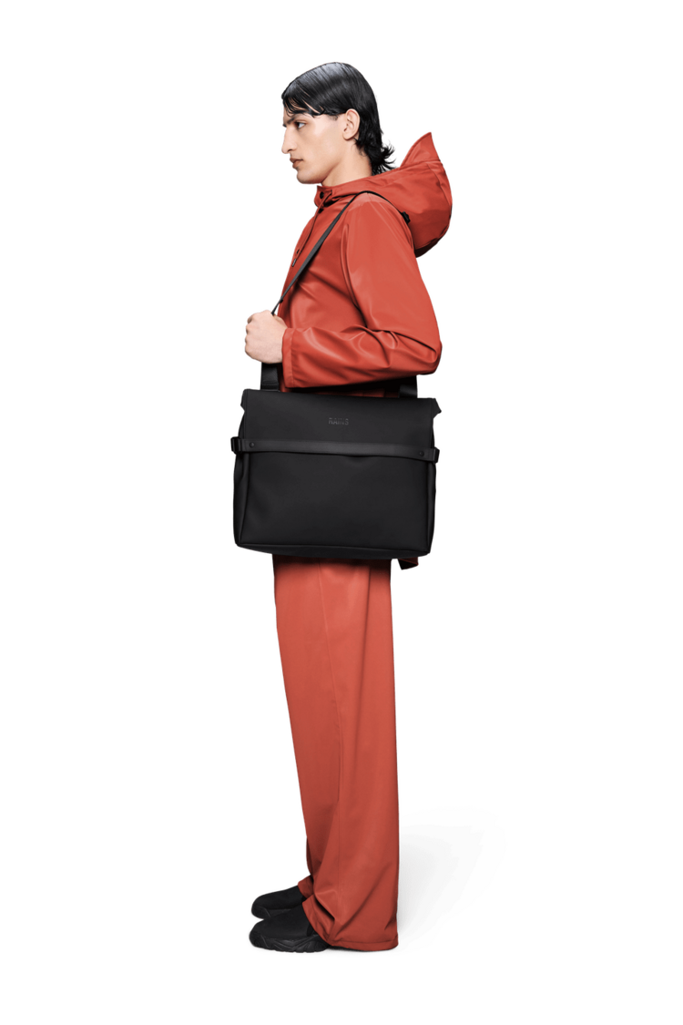 Inside, the bag is finished with Rains’ branded logo lining and includes a detachable tech pouch—ideal for portable documents, small tech, and other workday tools. A webbing shoulder strap ensures a comfortable carry.