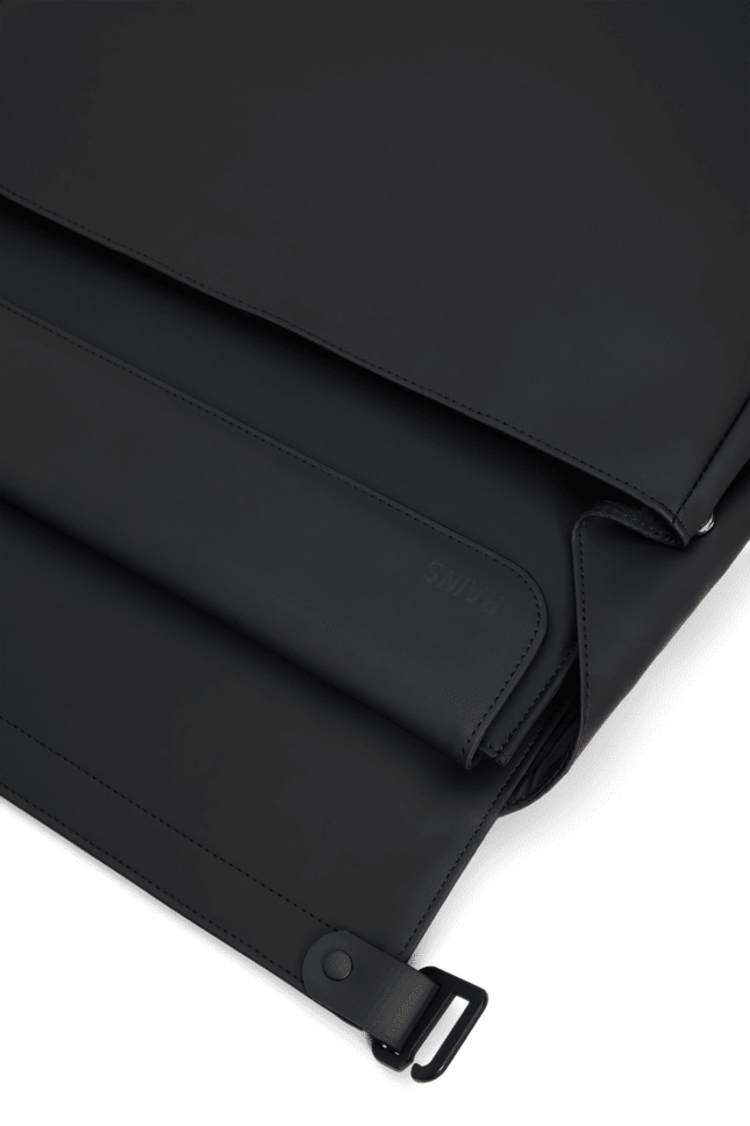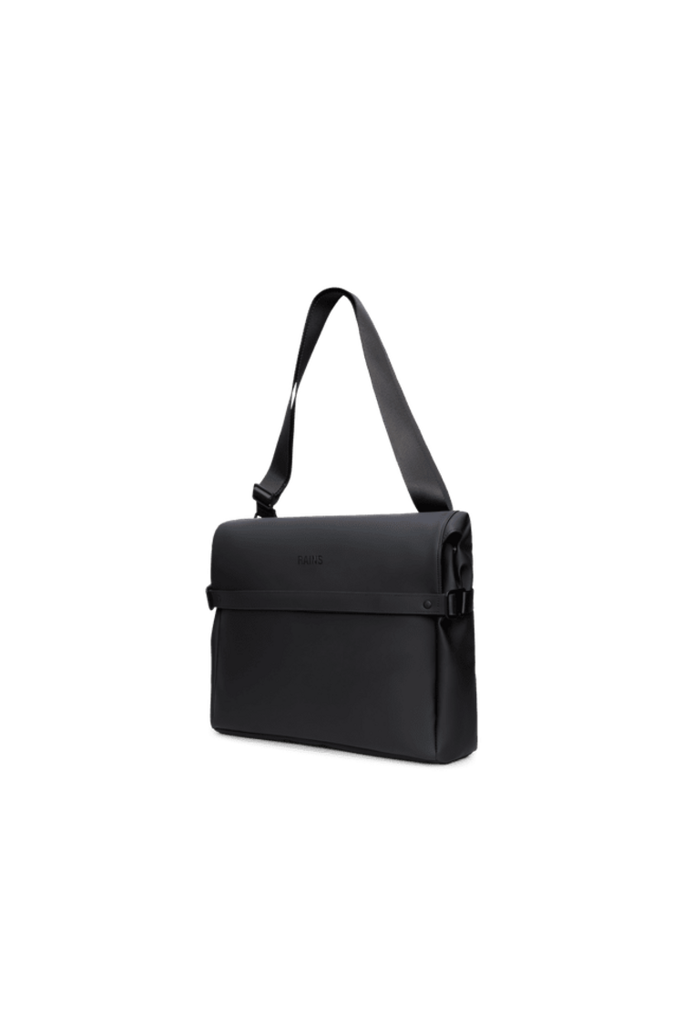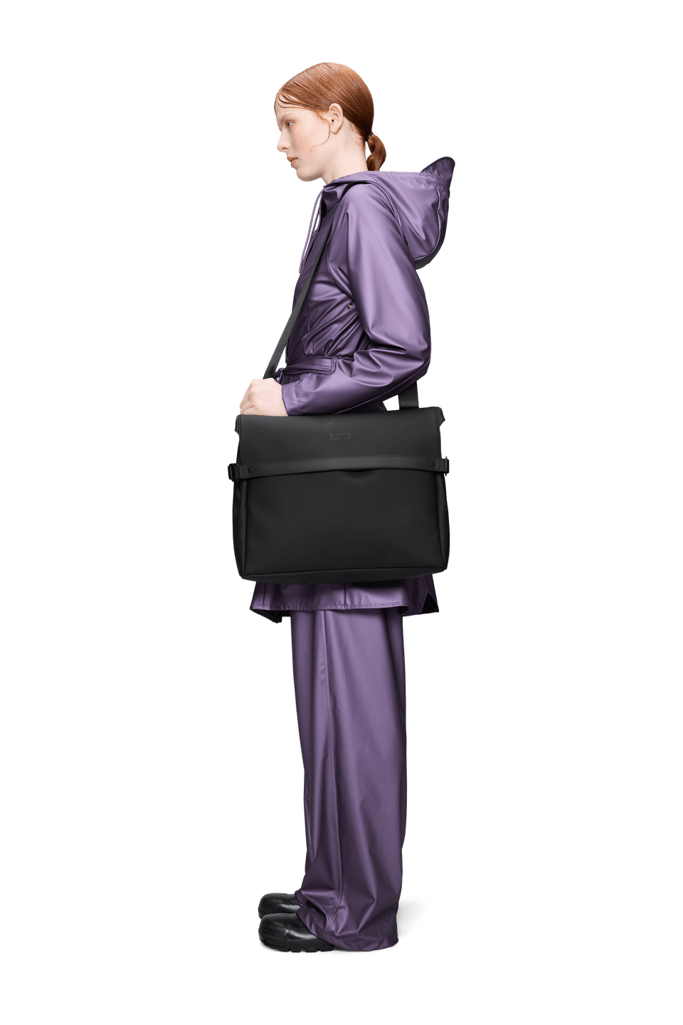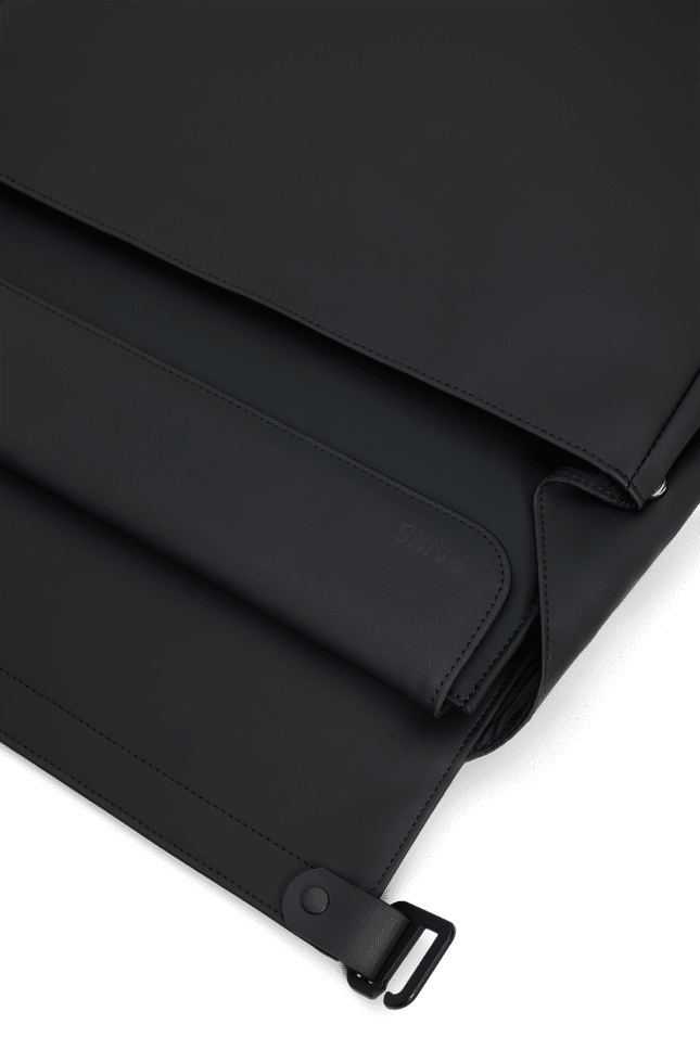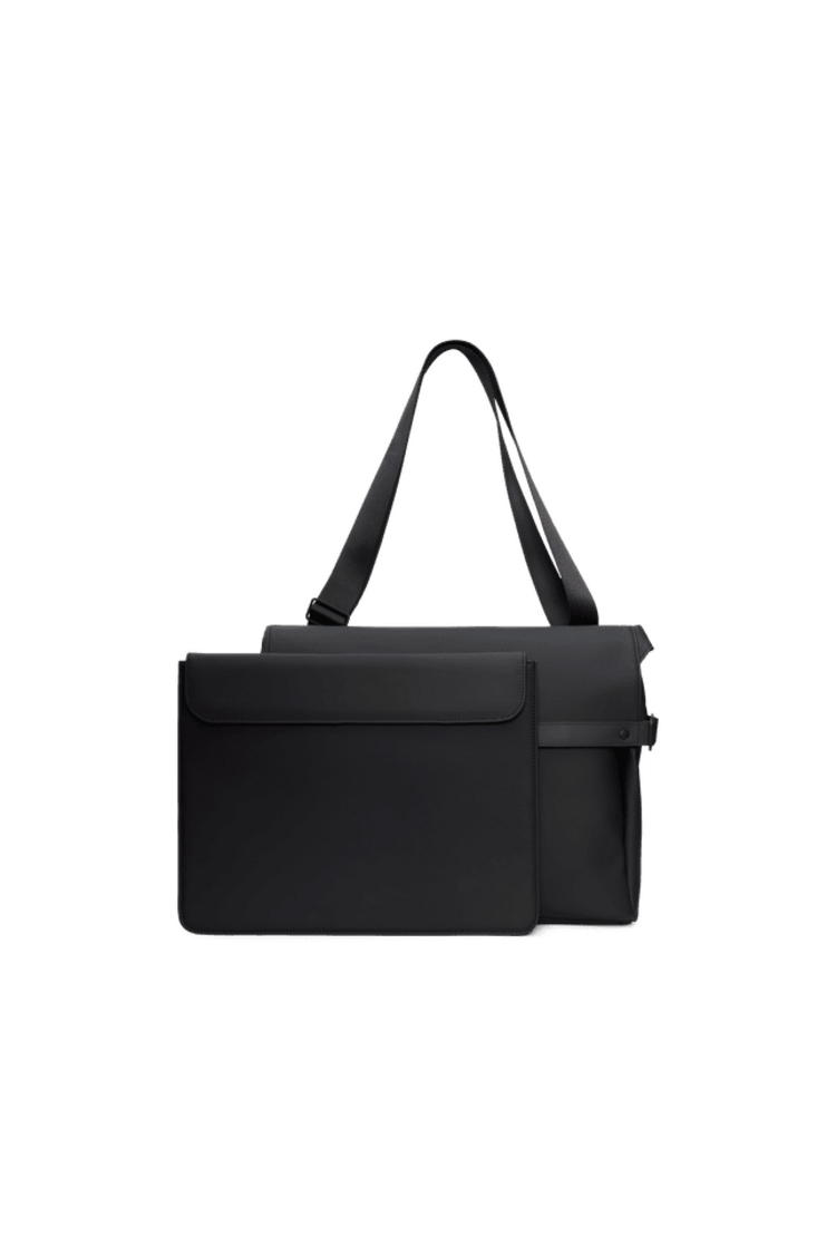 Inside, the bag is finished with Rains’ branded logo lining and includes a detachable tech pouch—ideal for portable documents, small tech, and other workday tools. A webbing shoulder strap ensures a comfortable carry.