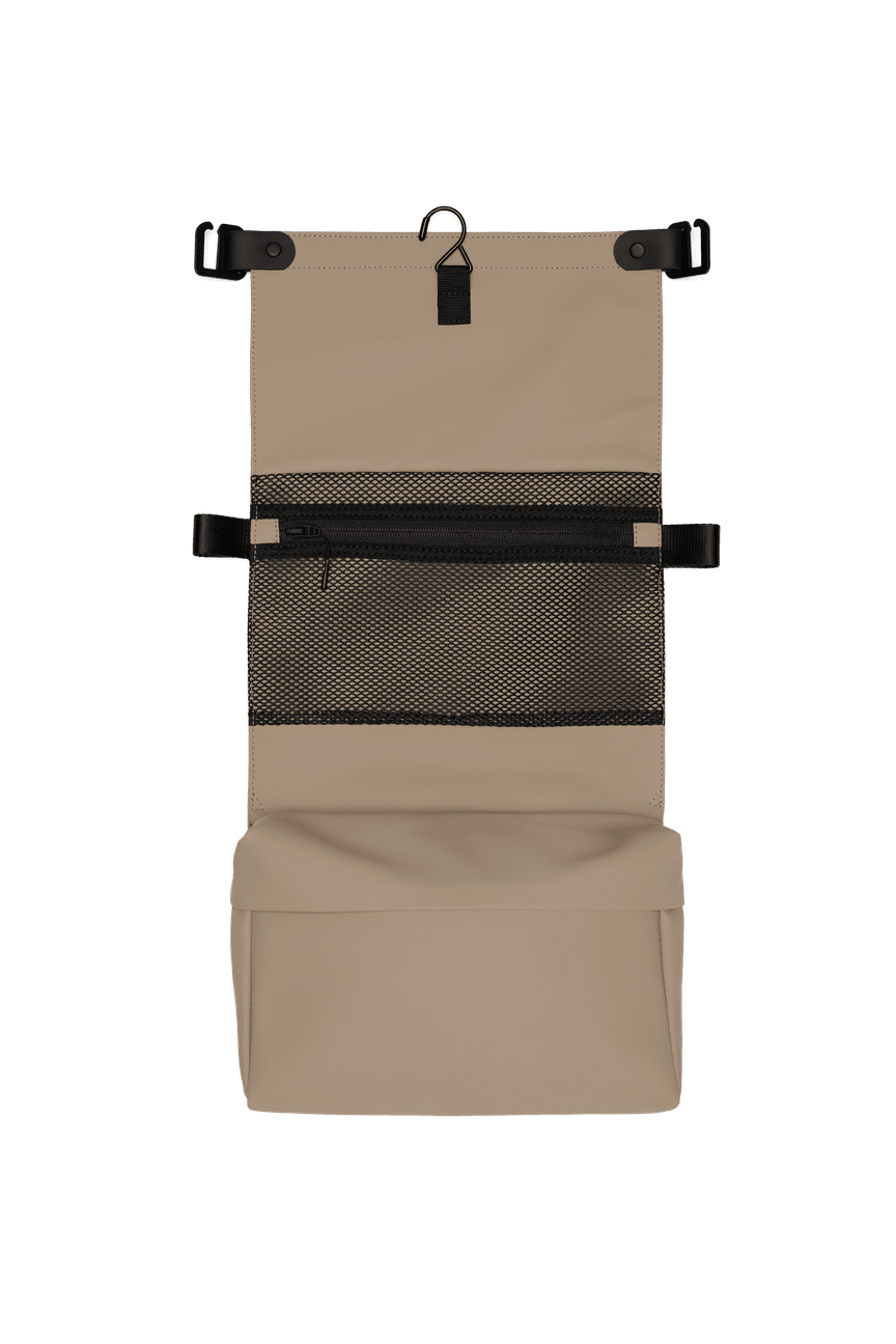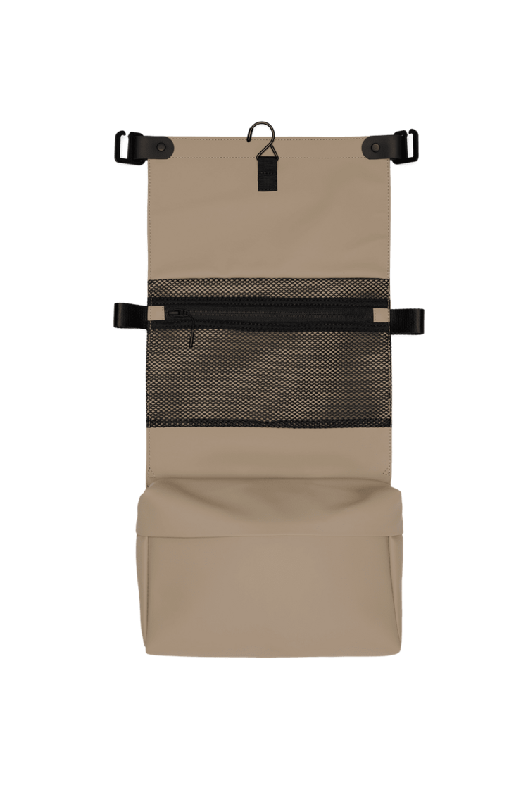 The design features a main zip compartment, an interior mesh pocket for tools and brushes, and an exterior zip pocket for quick-grab items. Unfold the bag and use the integrated hook to hang it up—ideal for hotel rooms, gym lockers or office restrooms. A flap with c-clips keeps everything secure when folded.