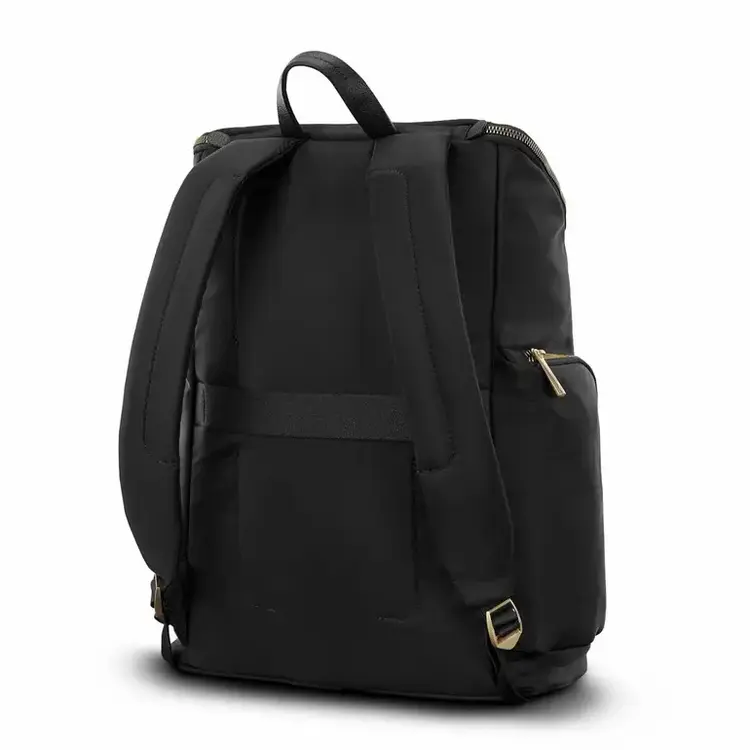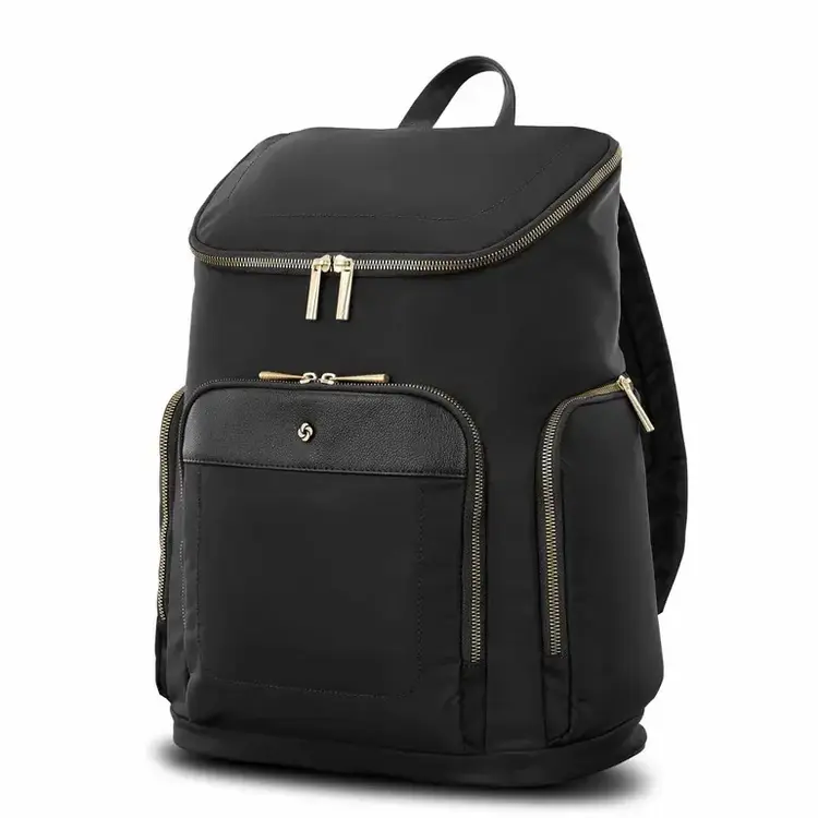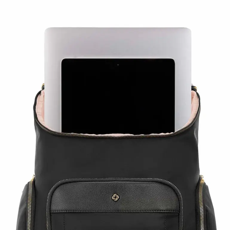 The Samsonite Deluxe Backpack offers stylish, organized storage with padded laptop and tablet sleeves, front and side pockets, and interior organizers. Padded straps provide comfort, and the StackIt™ strap easily attaches to rolling luggage for effortless travel.