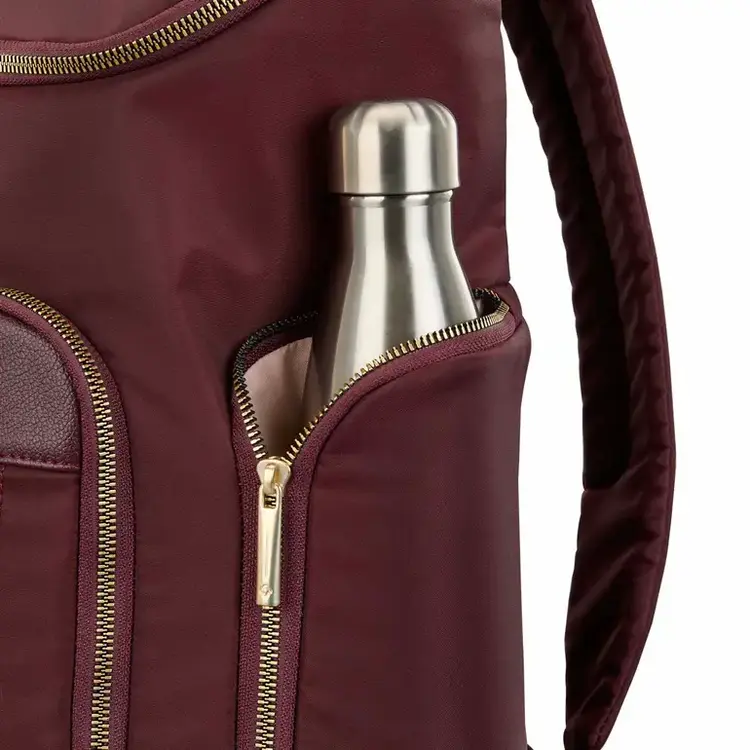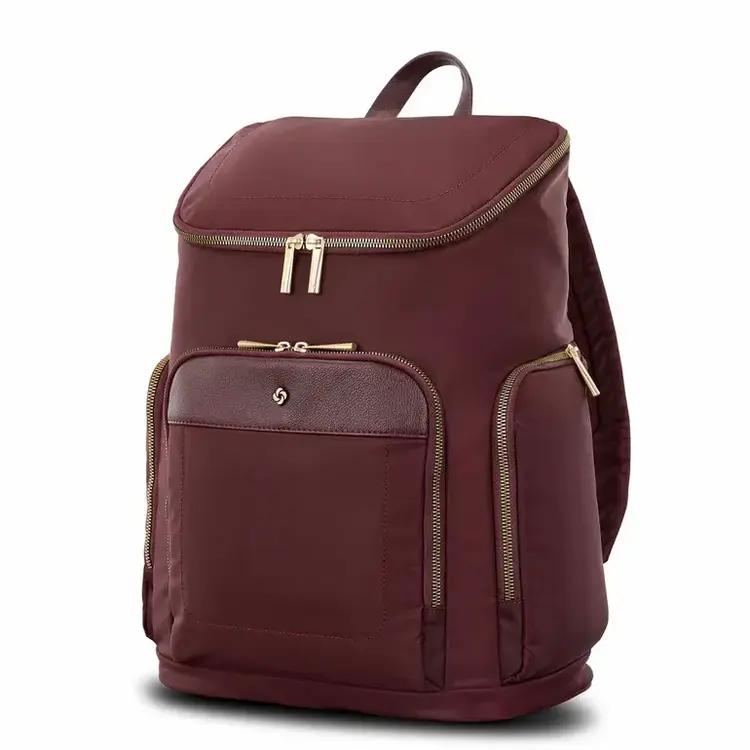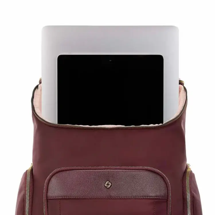 The Samsonite Deluxe Backpack offers stylish, organized storage with padded laptop and tablet sleeves, front and side pockets, and interior organizers. Padded straps provide comfort, and the StackIt™ strap easily attaches to rolling luggage for effortless travel.