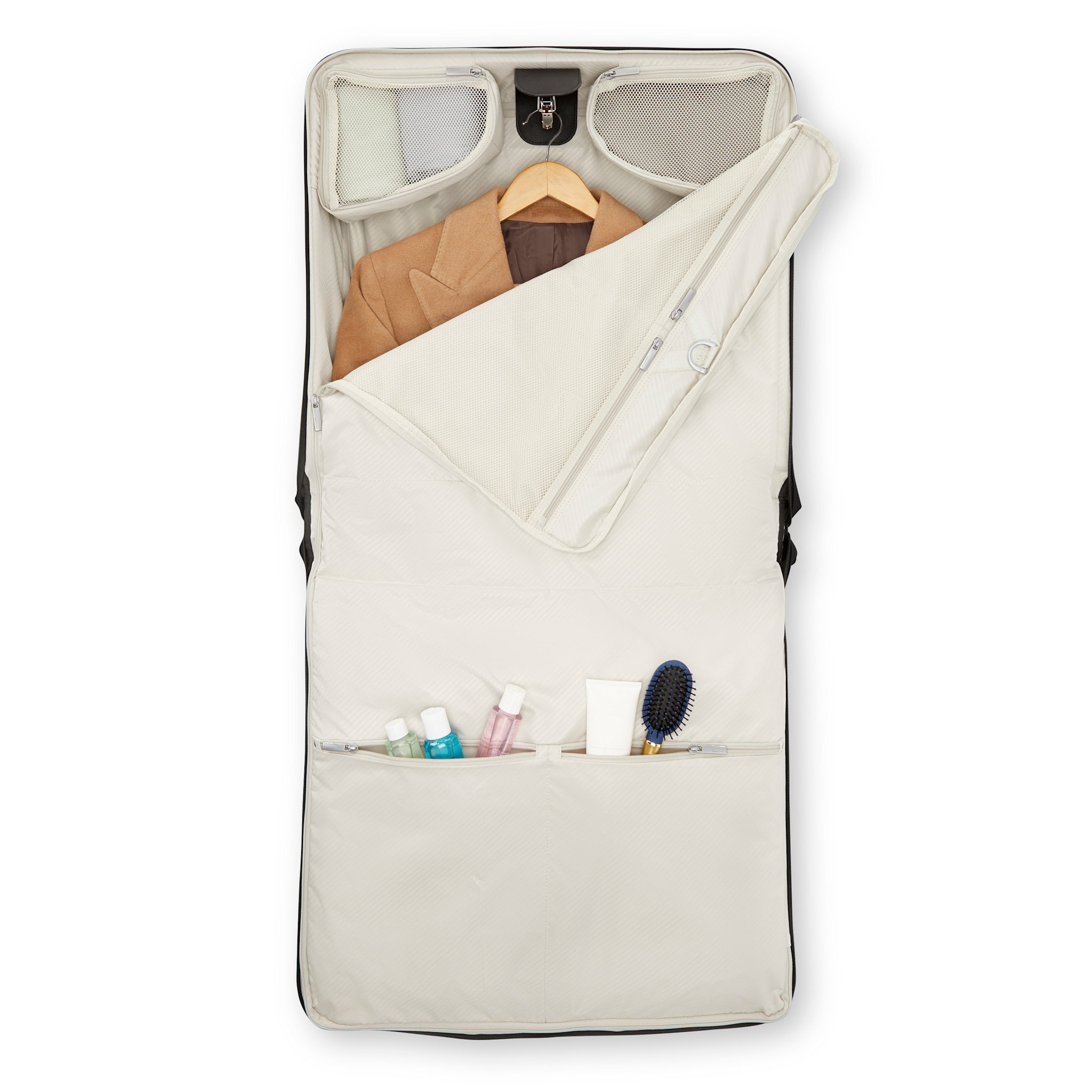 - Garment bag helps to keep your clothes virually wrinkle-free, and has multiple pockets for organization.
