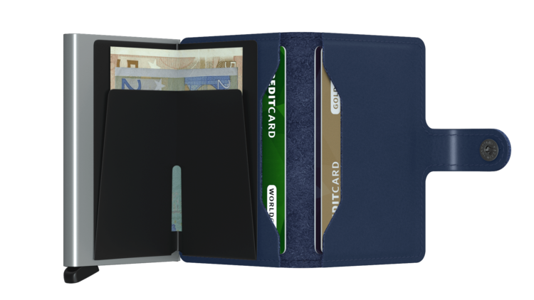 Small in size and surprisingly large in storage capacity, the Miniwallet combines the best of both worlds. The exterior holds banknotes, receipt and cards, while the aluminium Cardprotector allows you to slide out cards with one simple motion and protects them from bending, breaking and unwanted wireless communication.