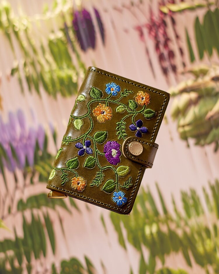 The Floral leather wallets are tanned by Tuscan leather artisans. La Bretagna, a family-owned business, is a pioneer in the production of vegetable-tanned leather. The remarkably deep colours and subtle shine are the effect of this vegetable tanning process. The in-house designed embroidery floral design is created bij Van Dongen en de Kroon, a Dutch family-owned company founded in 1780. Its eye-catching metal gold coloured lever is made from durable stainless-steel metal and especially crafted for this collection.