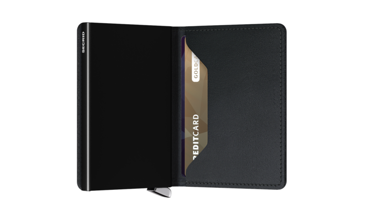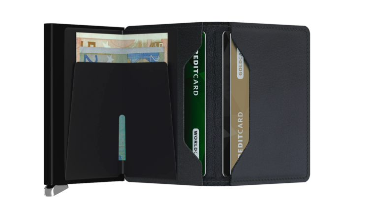 The Slimwallet is a modern upgrade from the classic bi-fold wallet. It has a slim profile and the generously cut leather holds at least an additional six cards, banknotes and business cards.The patented mechanism allows you to slide out your cards with one simple motion, cascading and ready for immediate use. The aluminum protects from bending, breaking and unwanted wireless communication (RFID protection).